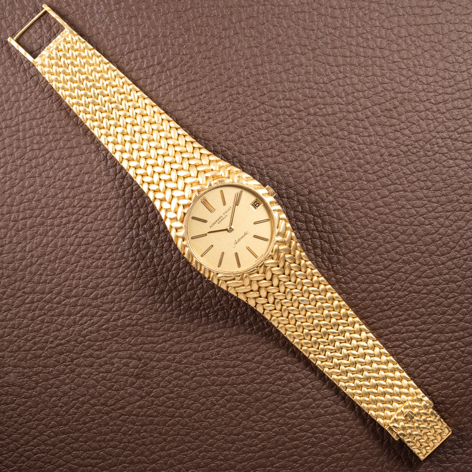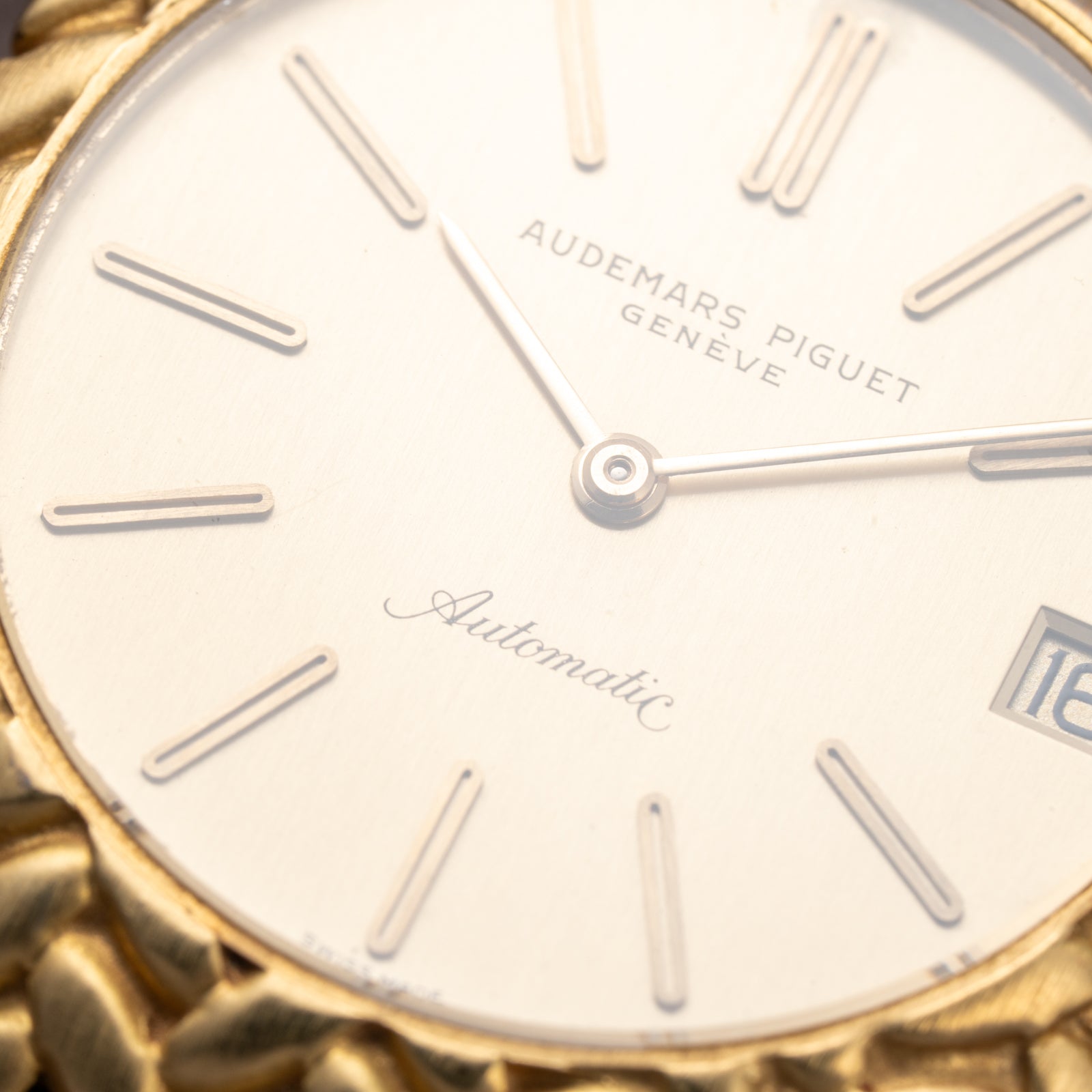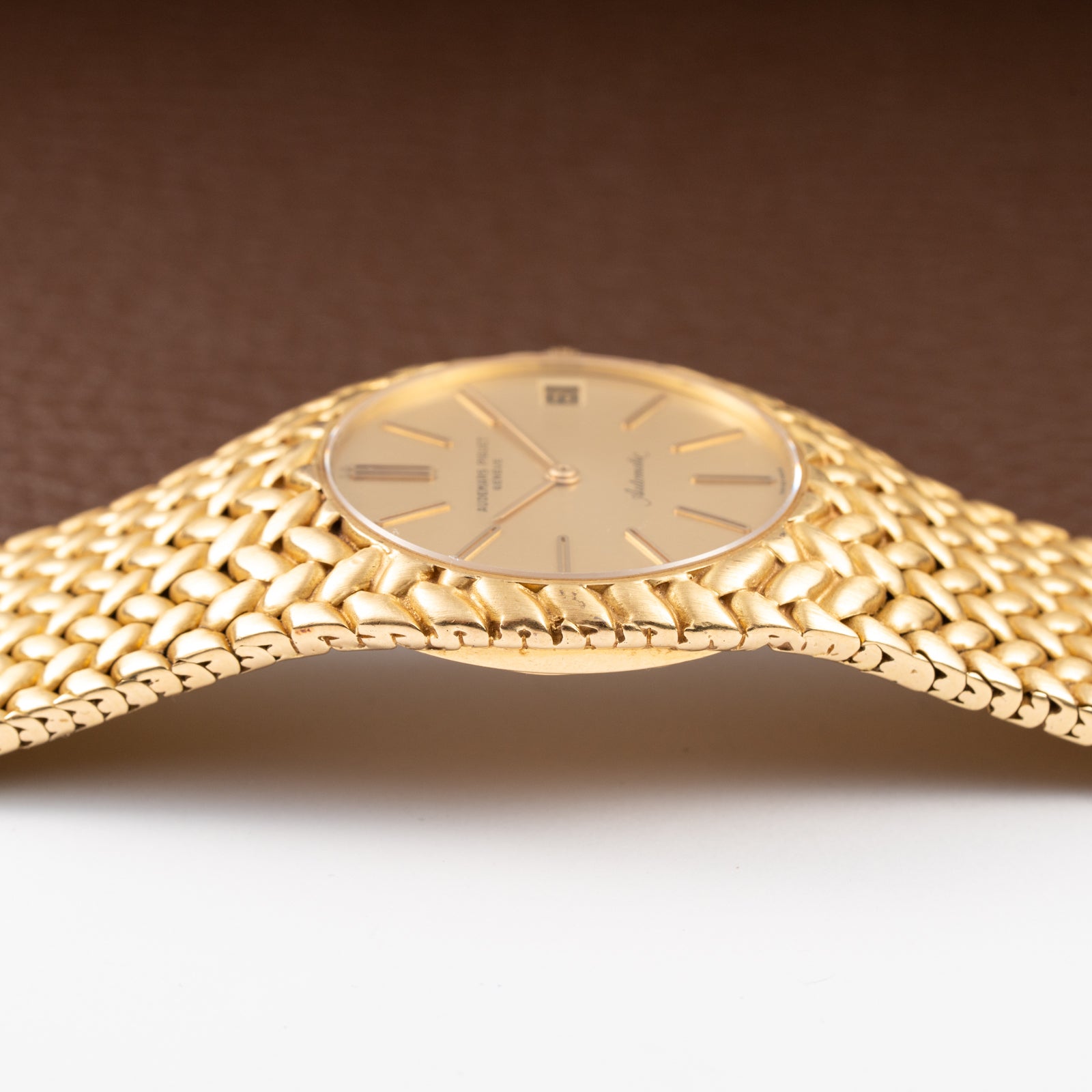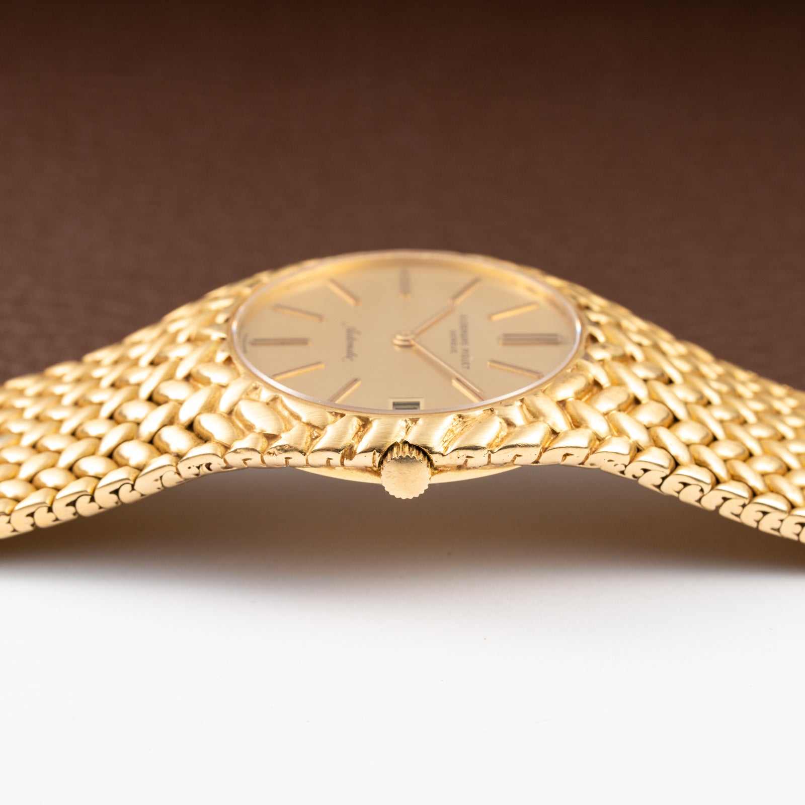The bracelet, composed of ten thick, hand-polished mesh links, widens seamlessly into the case, embracing the dial with perfect continuity. Genta himself described it as “a magnificent and perfect integration,” and few watches have achieved such sculptural coherence since.