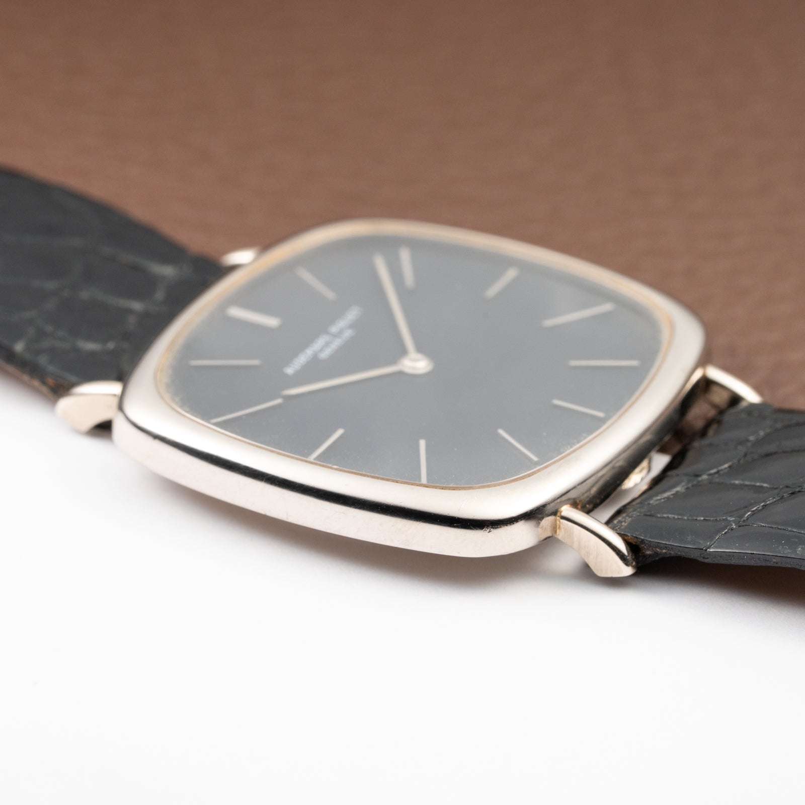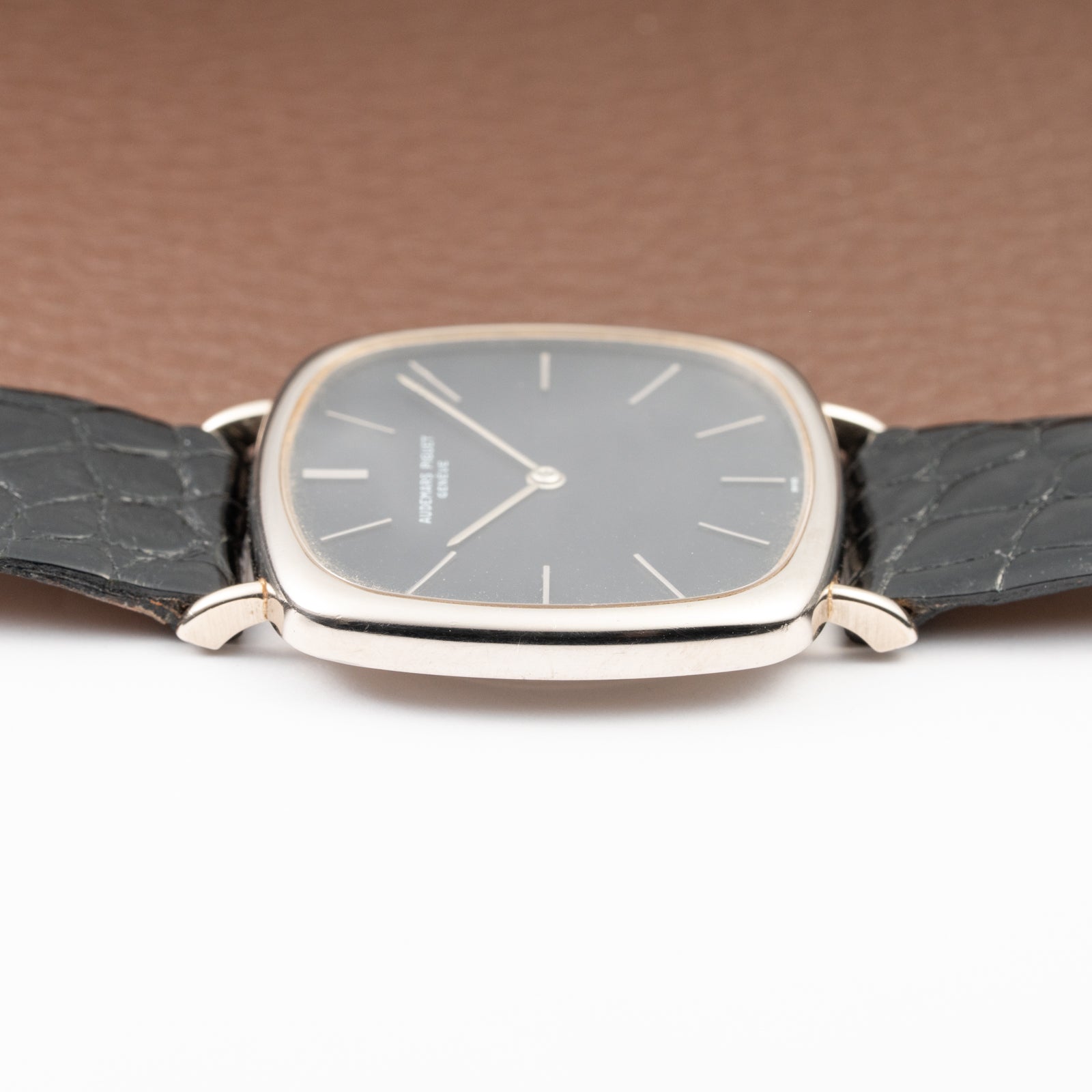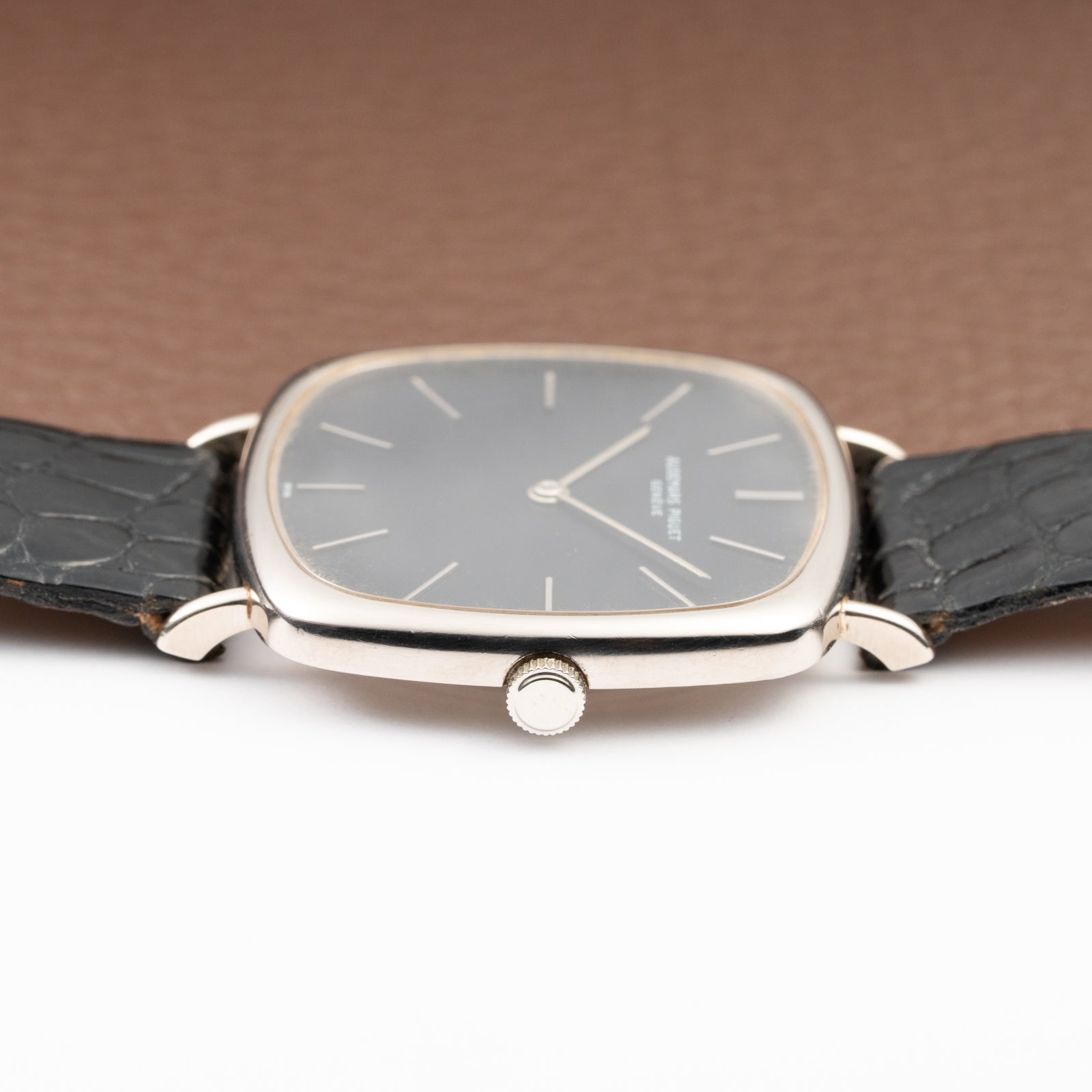 The 34 x 32 mm white gold case (excluding crown and lugs) is immediately recognizable for its distinctive “TV screen” design—a hallmark of avant-garde 1970s horology. With a lug-to-lug length of 39.5 mm, the watch wears elegantly yet confidently, its proportions perfectly capturing the interplay between geometry and refinement that defined Audemars Piguet’s experimental dress watches of the era.
