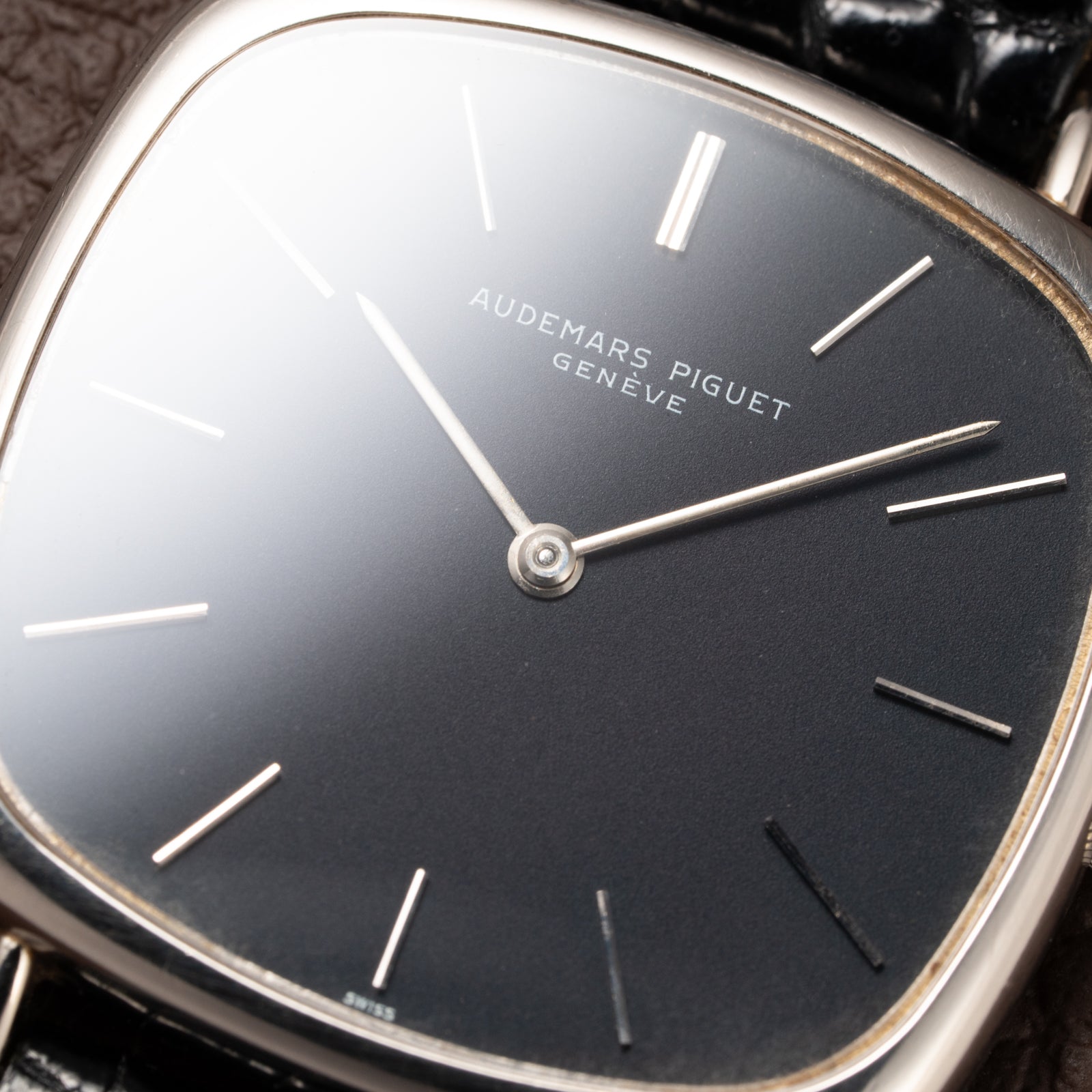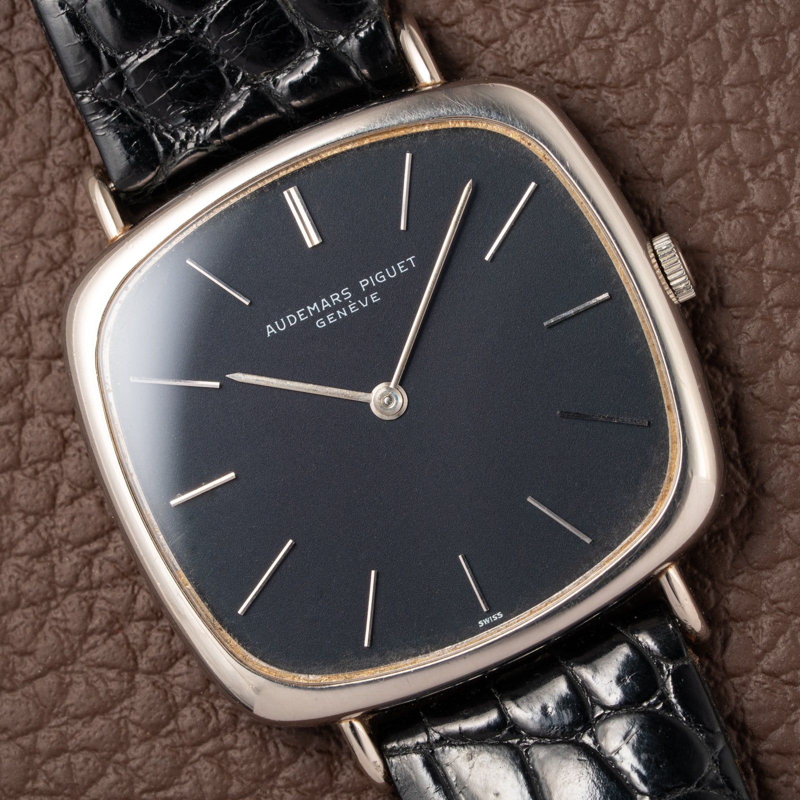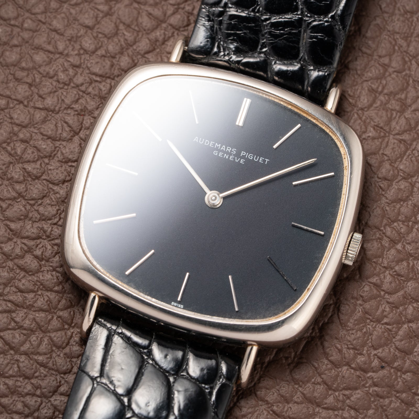 The 34 x 32 mm white gold case (excluding crown and lugs) is immediately recognizable for its distinctive “TV screen” design—a hallmark of avant-garde 1970s horology. With a lug-to-lug length of 39.5 mm, the watch wears elegantly yet confidently, its proportions perfectly capturing the interplay between geometry and refinement that defined Audemars Piguet’s experimental dress watches of the era.