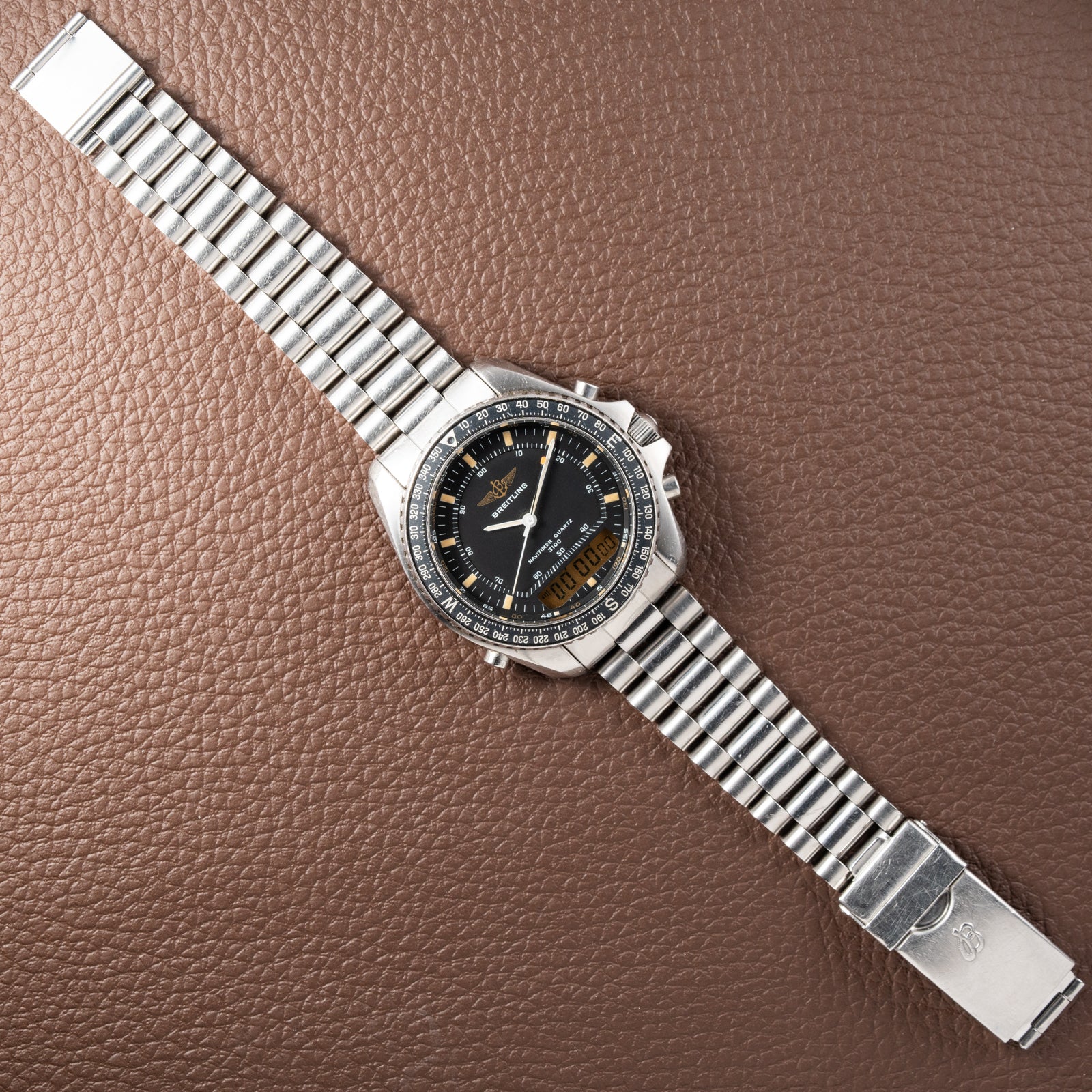 The original black Breitling dial, accented by aged tritium lume, evokes a functional, mission-ready look. Over time, the luminous material has matured into a rich mustard hue, offering a pleasing vintage contrast against the matte dial surface. This patina is a visual nod to the watch’s 1990s roots and adds real collector character. The multi-function digital display—integrated discreetly into the analog layout—provides essential pilot information at the touch of a button, including GMT, chronograph, alarm, and date features.