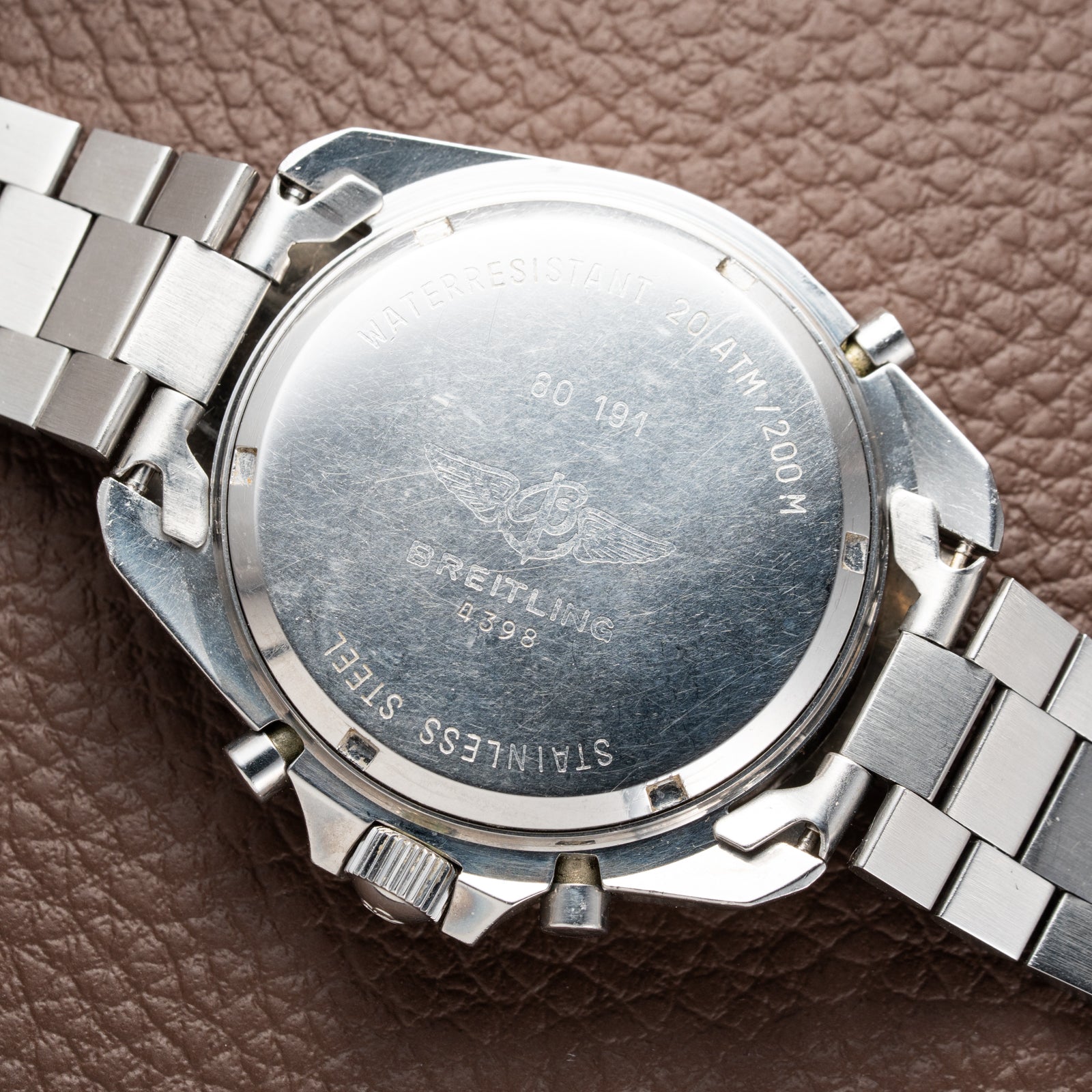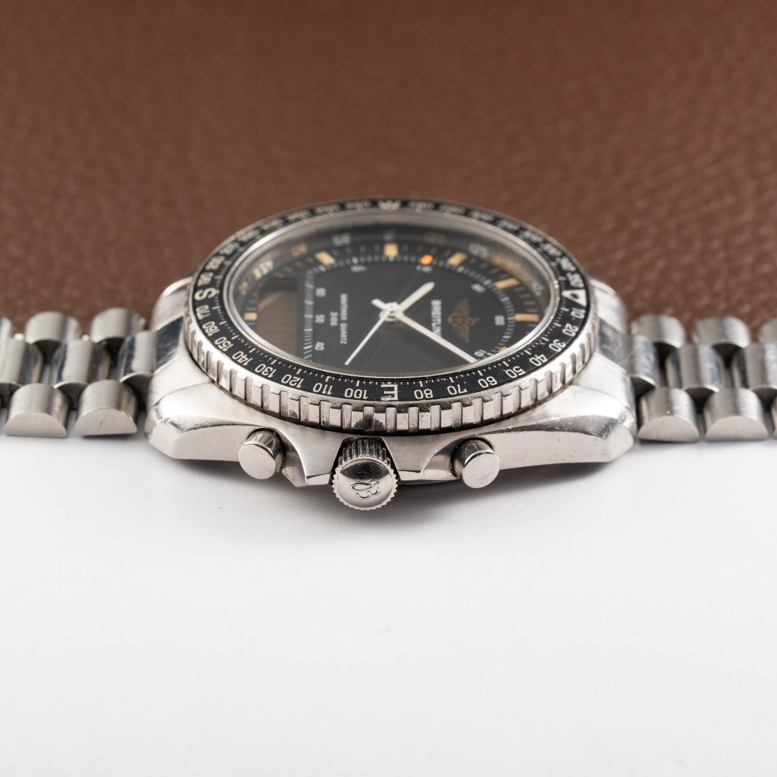 Secured to the wrist by its original Breitling-signed steel bracelet, this A51037 offers both comfort and durability. Notably long, the bracelet is suitable for larger wrists or layering over a flight suit—a functional consideration from the brand’s aviation heritage. Its integrated clasp and polished center links contrast subtly with the toolish case, giving the piece an edge of refinement.