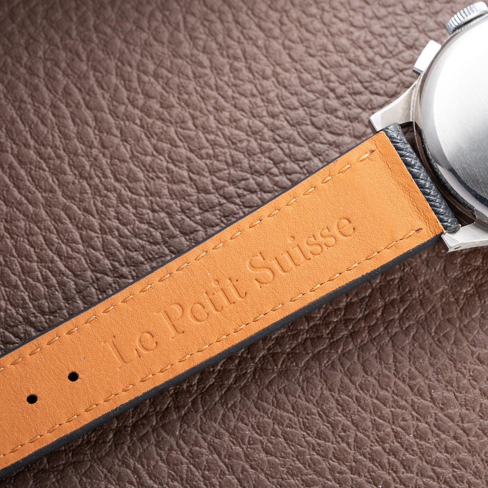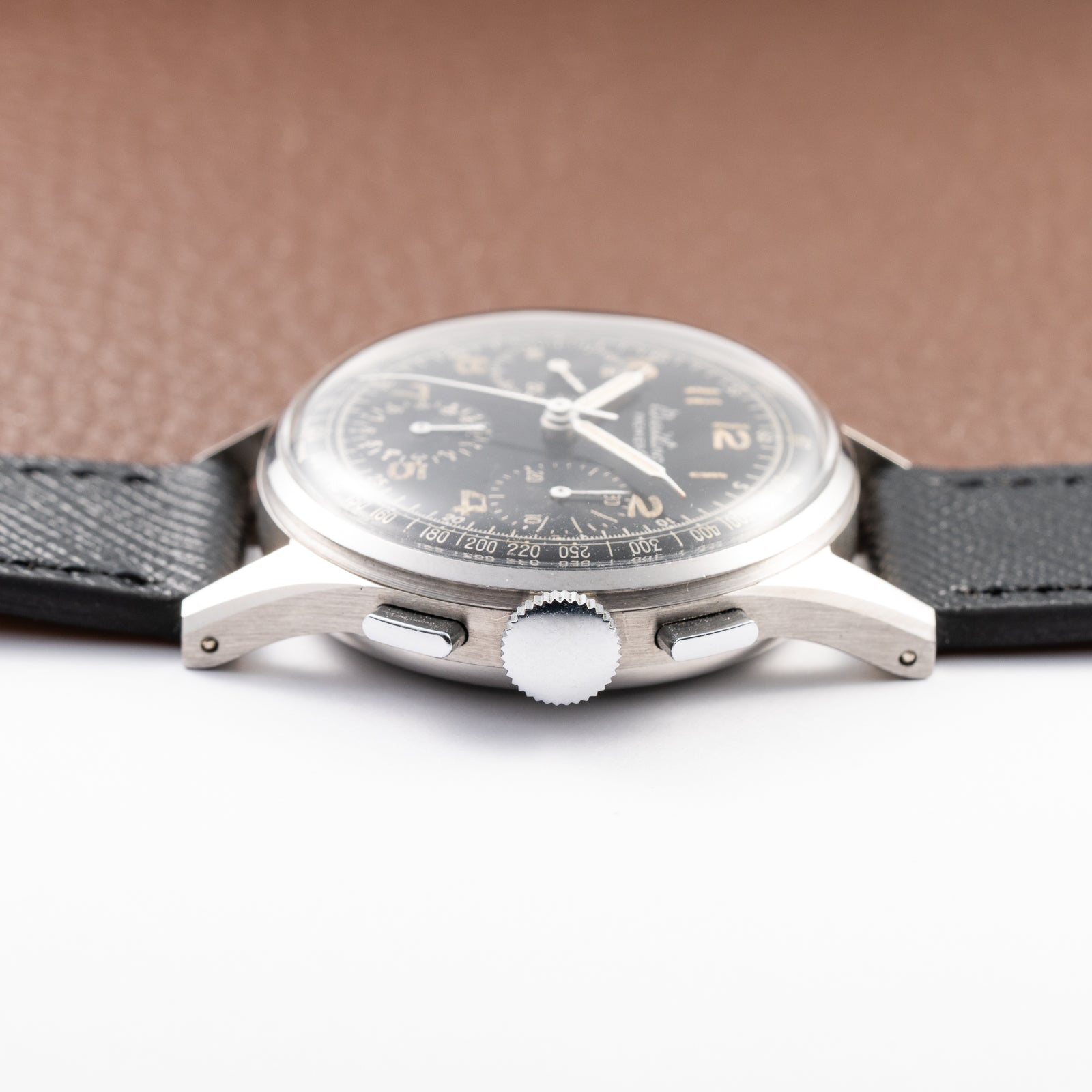 The 35mm stainless steel case remains entirely unpolished, showcasing razor-sharp lug edges and factory-defined lines rarely found on a watch of this age. The untouched surfaces bring out the rugged beauty and historical integrity of this chronograph, offering an authentic connection to the 1940s. The unsigned original Breitling crown—a rarity in itself—remains fitted, underscoring the watch’s untouched originality.