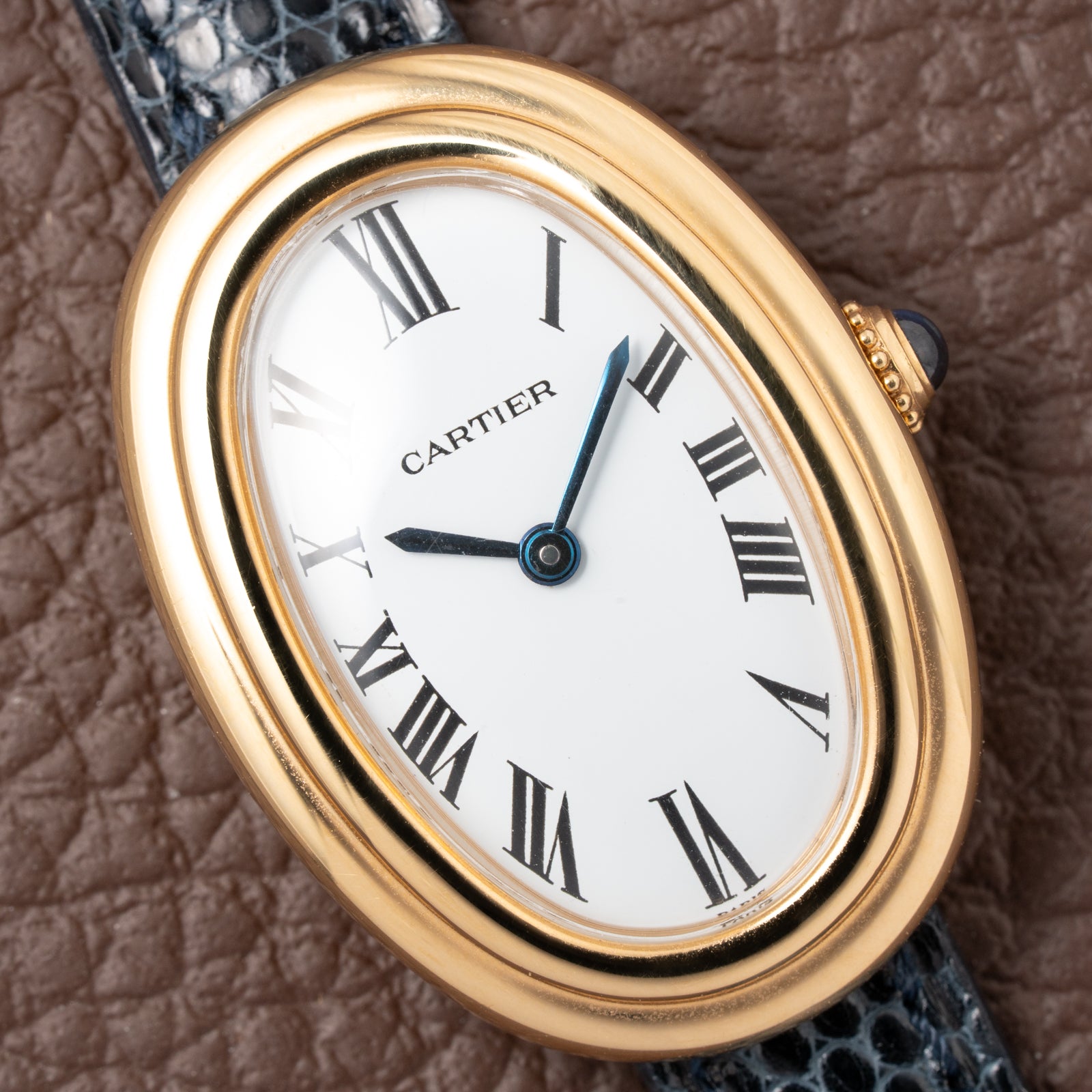 The gently elongated oval case, measuring 22 x 31 mm, embodies the Baignoire’s signature form—named after the French word for “bathtub,” a nod to its gracefully curved silhouette. Executed in 18K yellow gold, the case radiates warmth and refinement, with beautifully proportioned contours that sit effortlessly on the wrist.