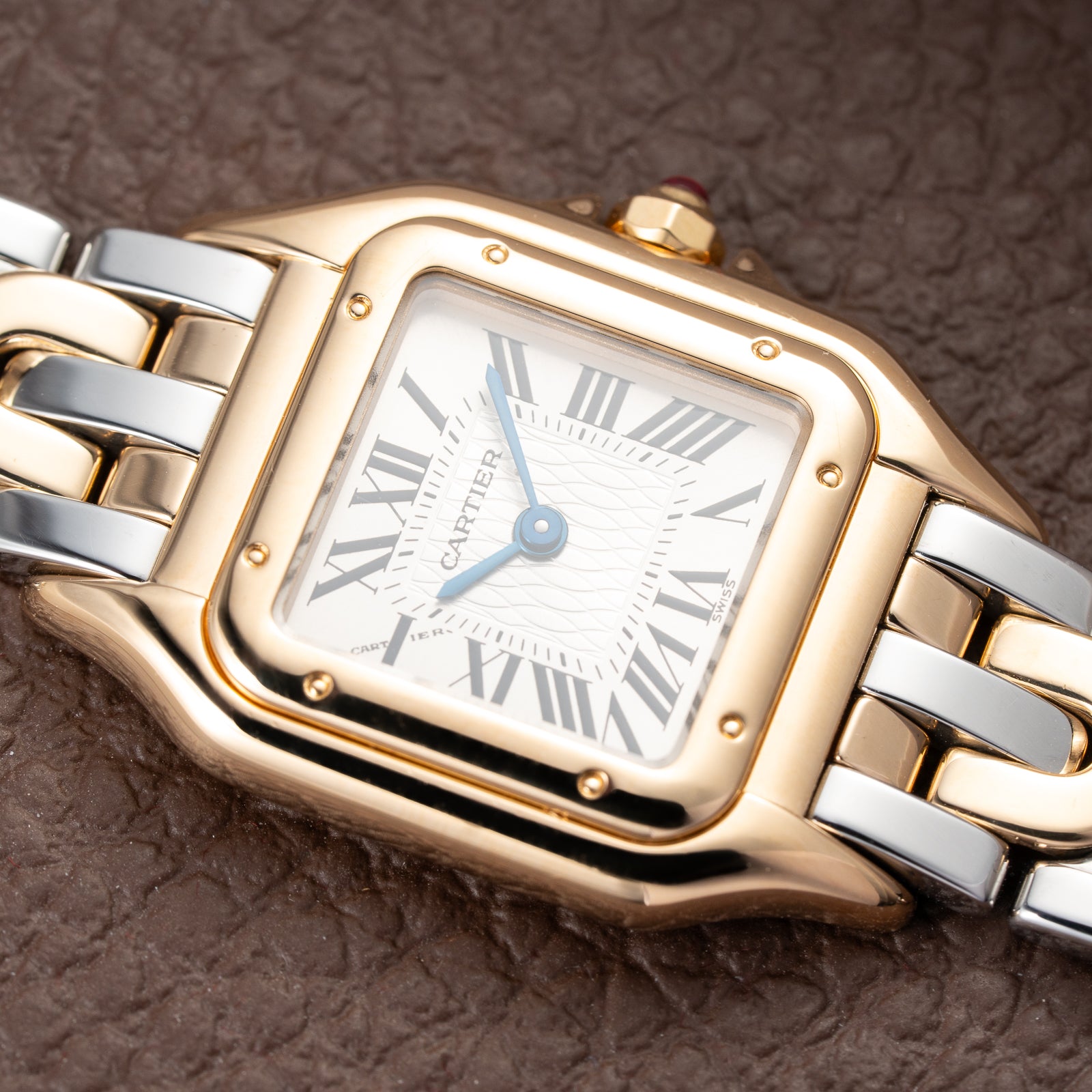 The watch features the signature Cartier crown set with a red ruby cabochon, a distinctive detail that sets this anniversary model apart from the more commonly seen sapphire-set Panthère watches.