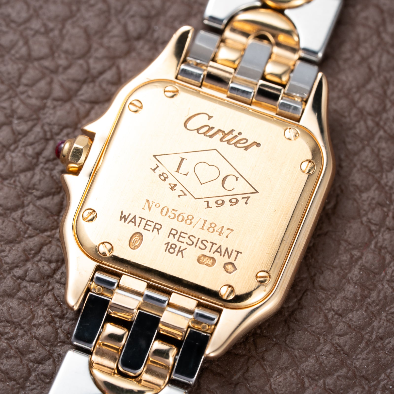 The caseback is engraved, marking the watch as part of the 150th Anniversary limited edition of 1847 pieces, commemorating the founding year of Cartier.