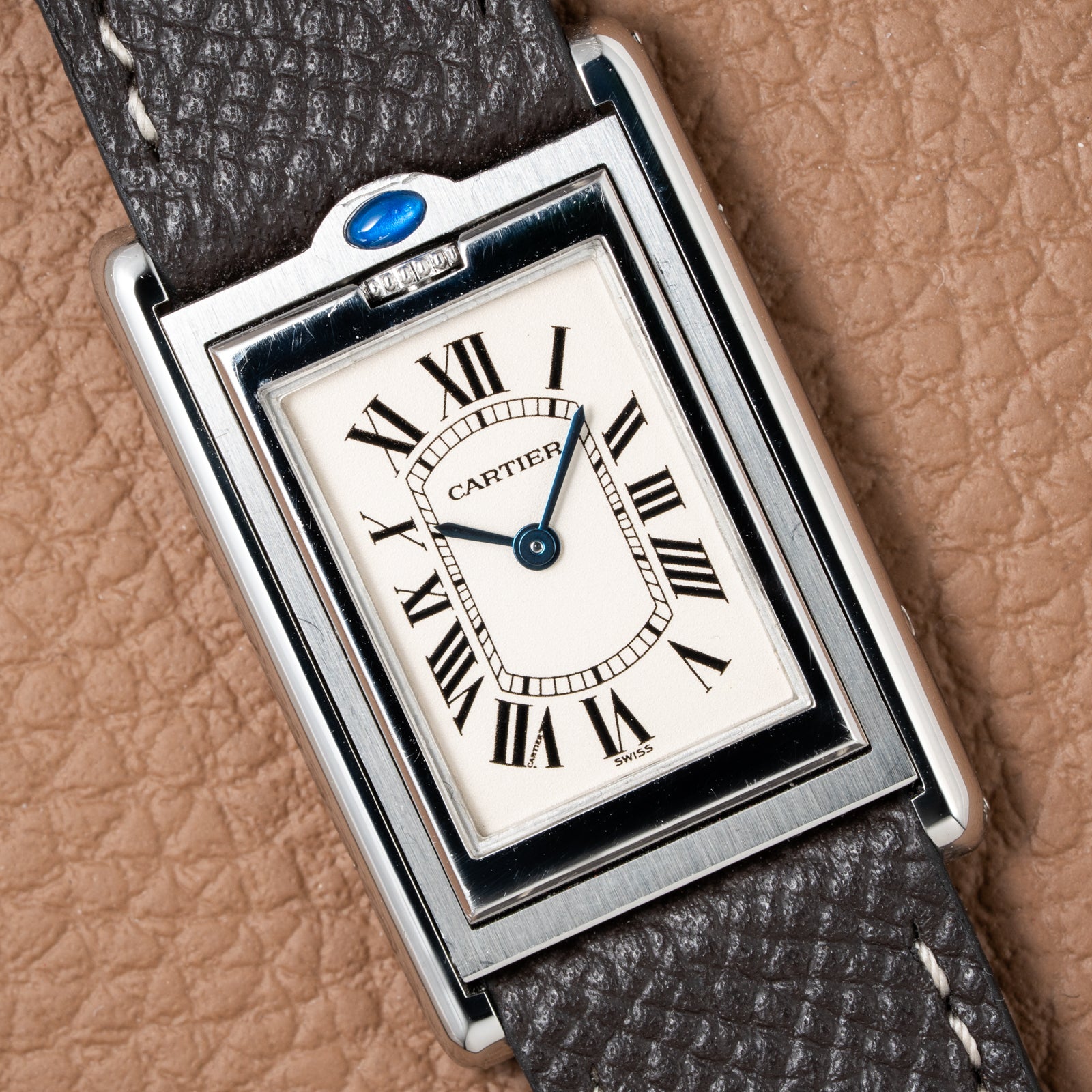 Paired with a handmade leather strap, crafted in Belgium for superior texture and durability, this Basculante is fastened with the original Cartier stainless steel buckle, a desirable and authentic finishing touch that completes the ensemble.