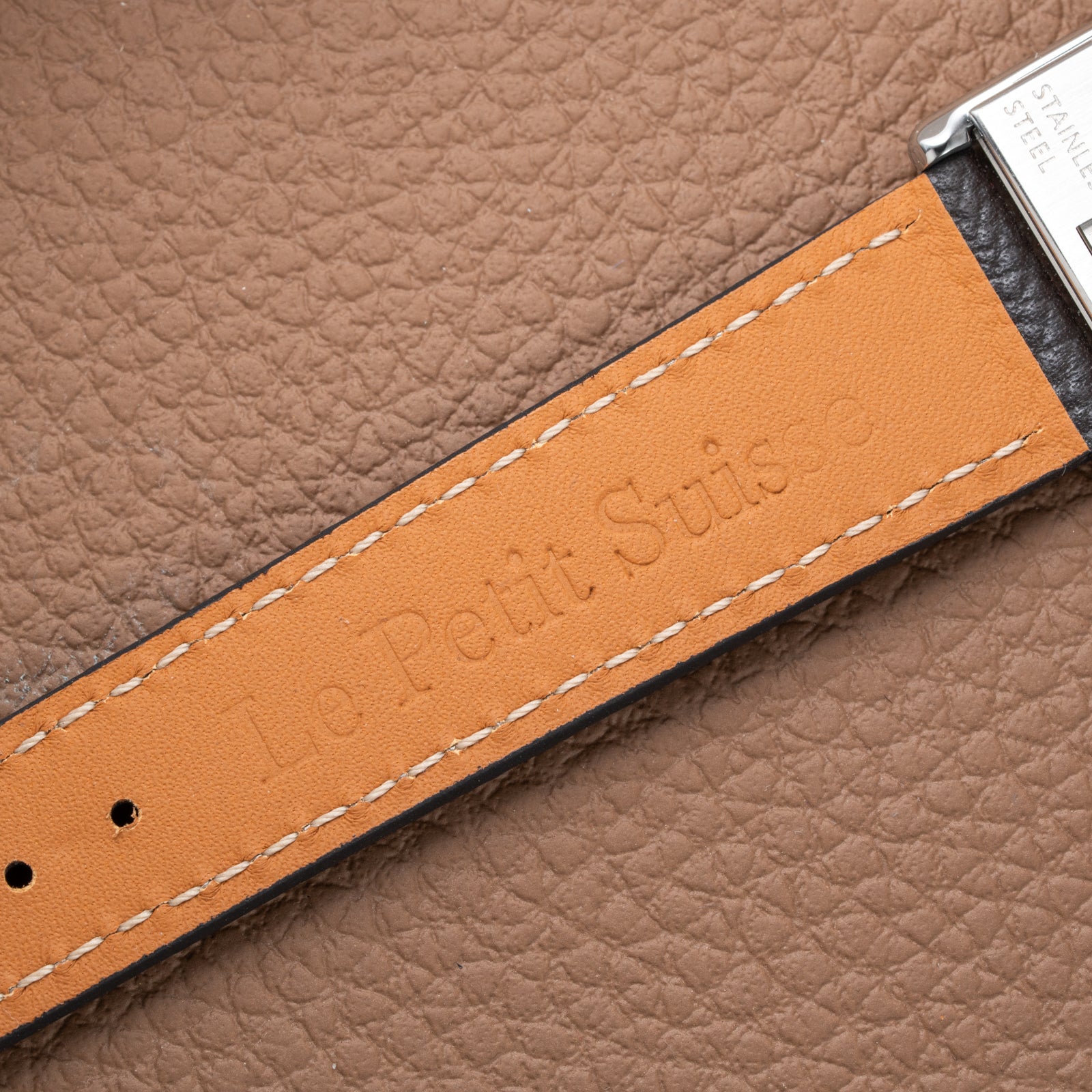 Case: Polished stainless steel, approximately 24mm x 35mm – refined and compact, yet substantial enough to feel secure and luxurious on the wrist.