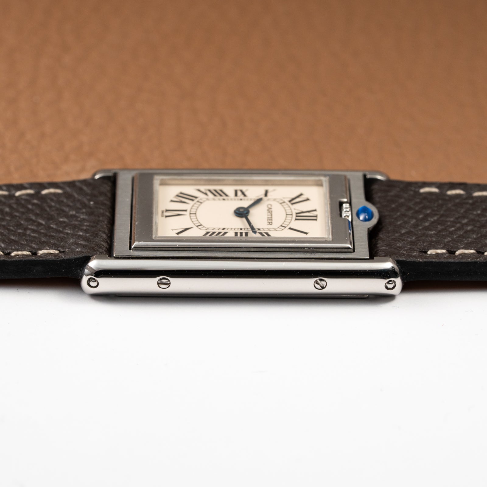 The timepiece is fronted by a white dial with bold black Roman numerals, a timeless Cartier hallmark. The blued steel sword hands add a graceful pop of color and reinforce the classic aesthetic. Subtle detailing—such as the railroad minute track and the hidden Cartier signature at “VII”—underline the brand’s meticulous craftsmanship.