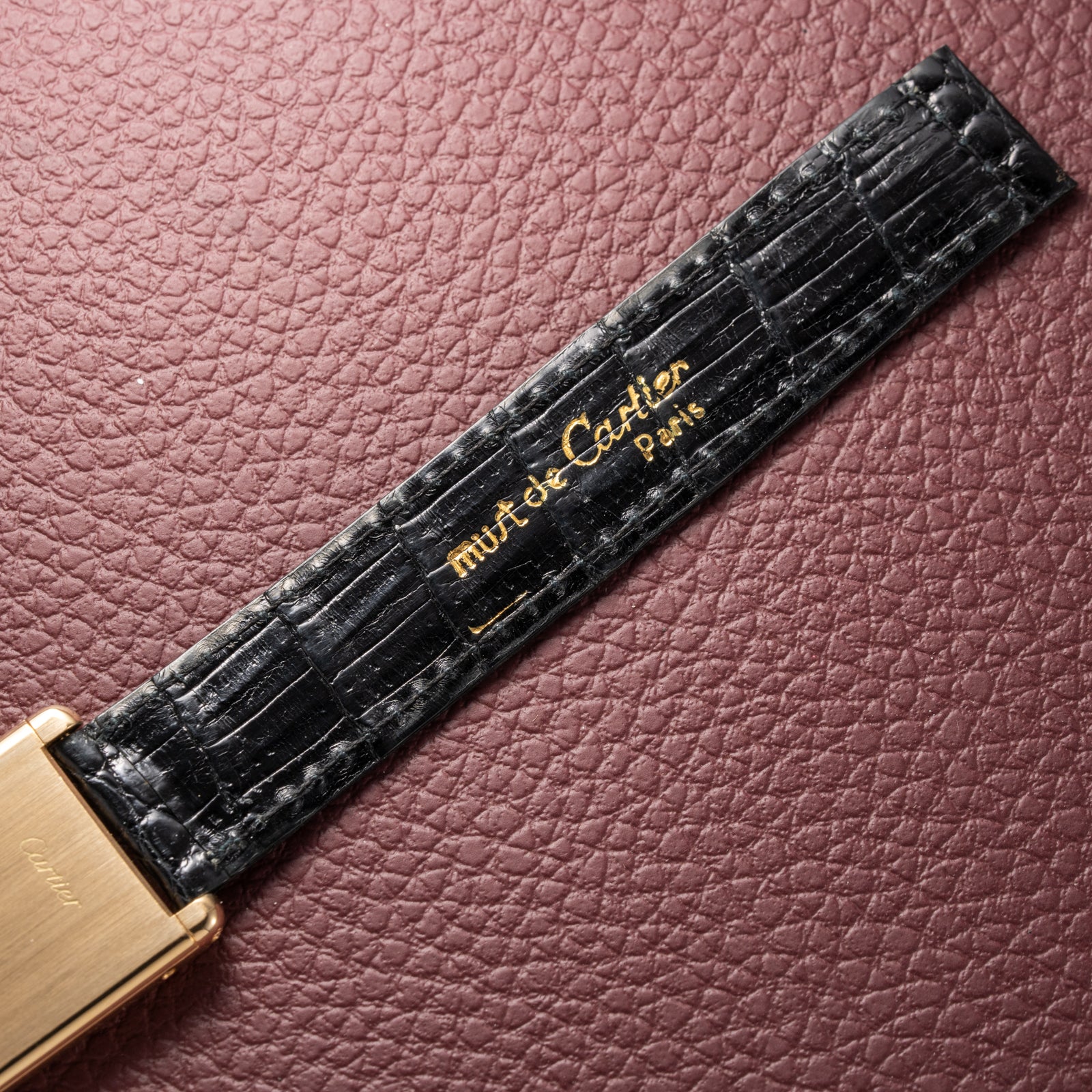 Bracelet: Original Cartier alligator leather strap, showing light wear but maintaining its structure and elegance.