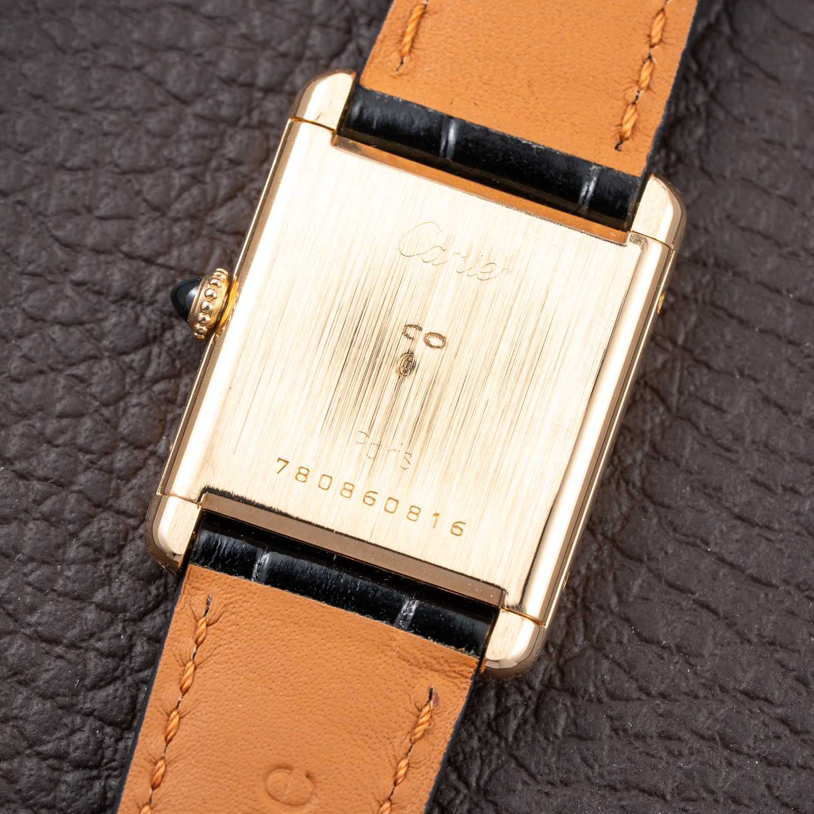The solid 18K yellow gold case retains its strong geometry and elegant proportions characteristic of the Tank Louis design. In the GM / LM large size, it offers excellent wrist presence while remaining unmistakably refined. The sapphire cabochon crown, set with a deep blue sapphire, completes the iconic Cartier look.