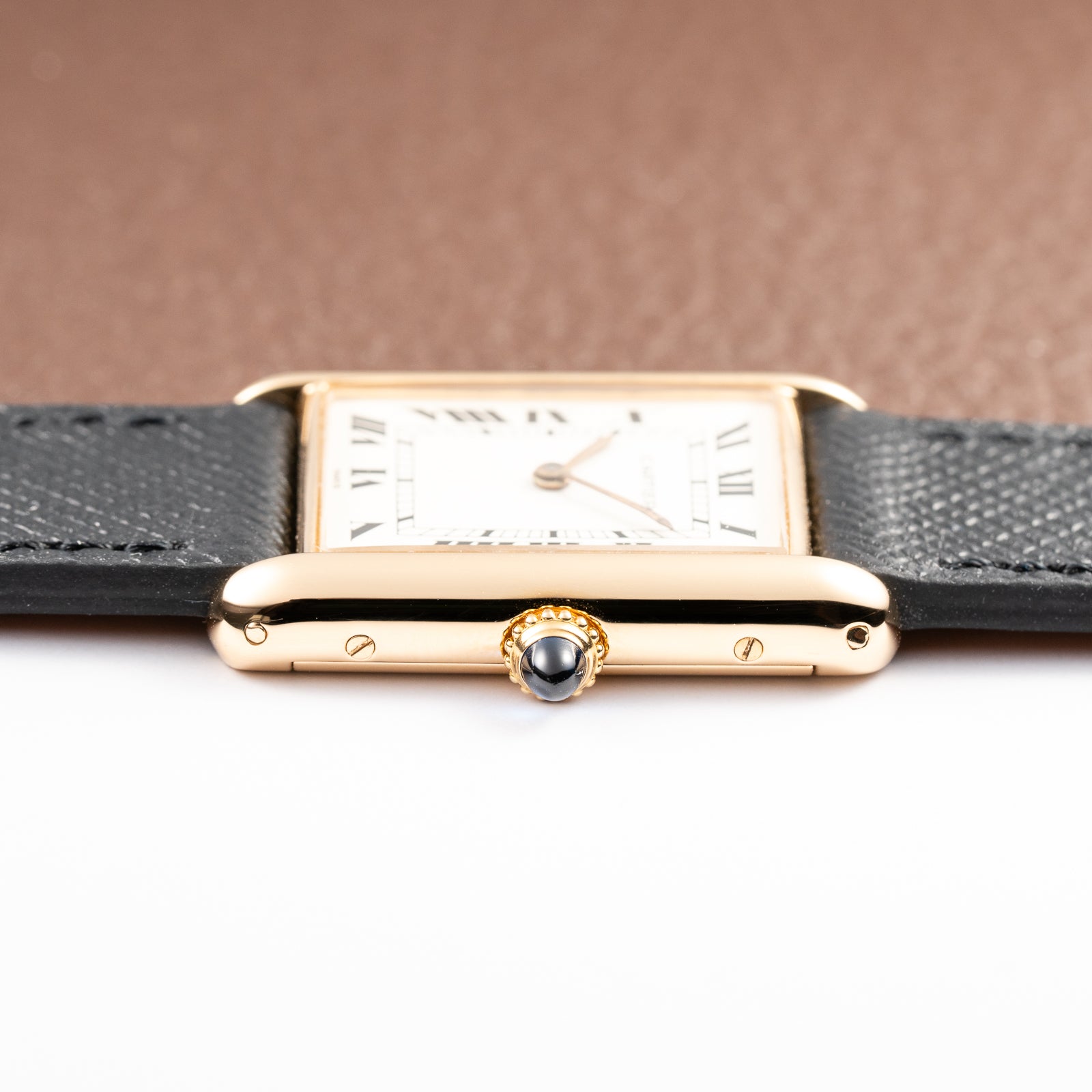 The iconic sapphire cabochon crown, set with a deep blue sapphire, completes the classic Cartier silhouette.