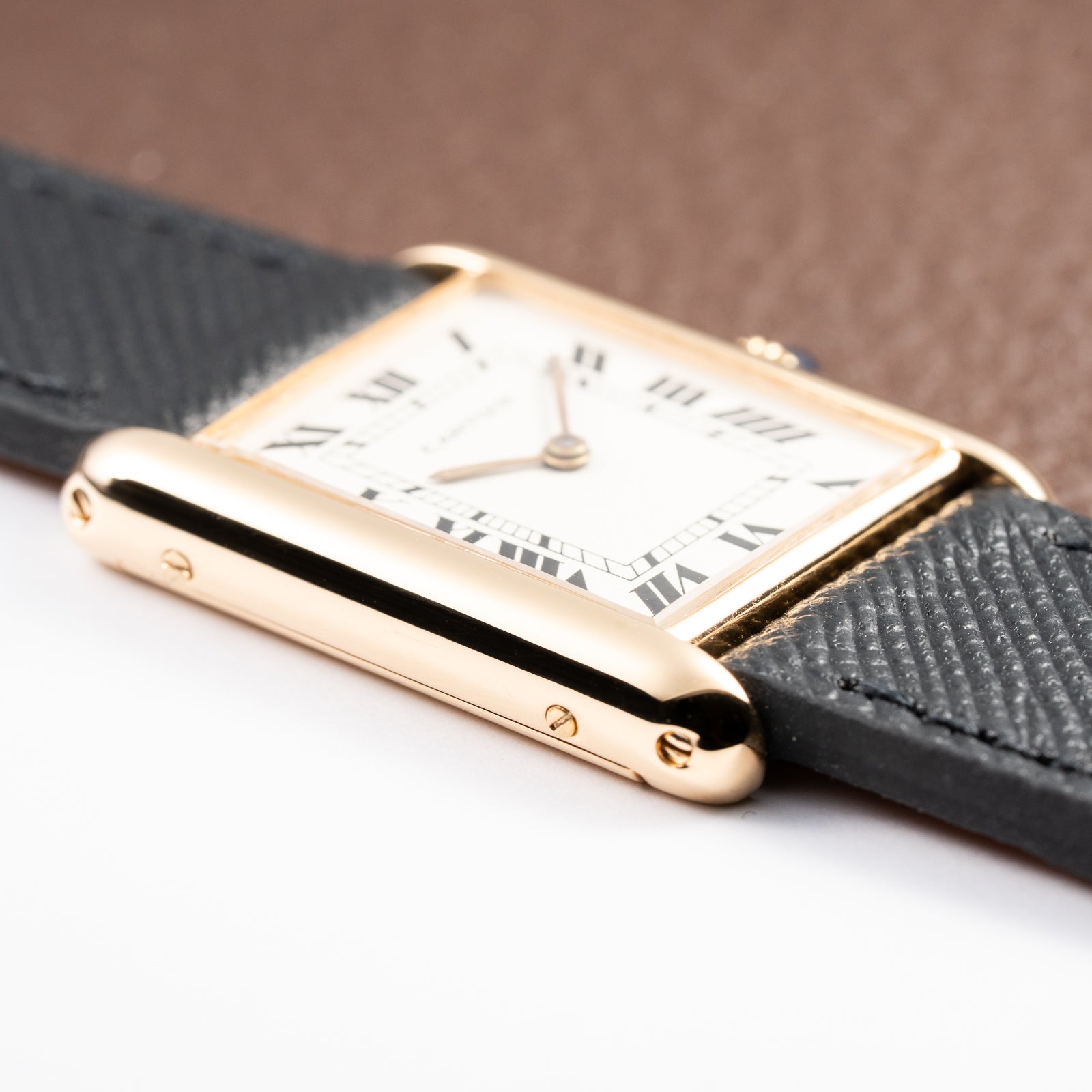 The solid 18K yellow gold case is in great condition, retaining the elegant geometry that defines the Tank Louis design. In the GM / LM large size, it offers excellent wrist presence while remaining unmistakably refined.