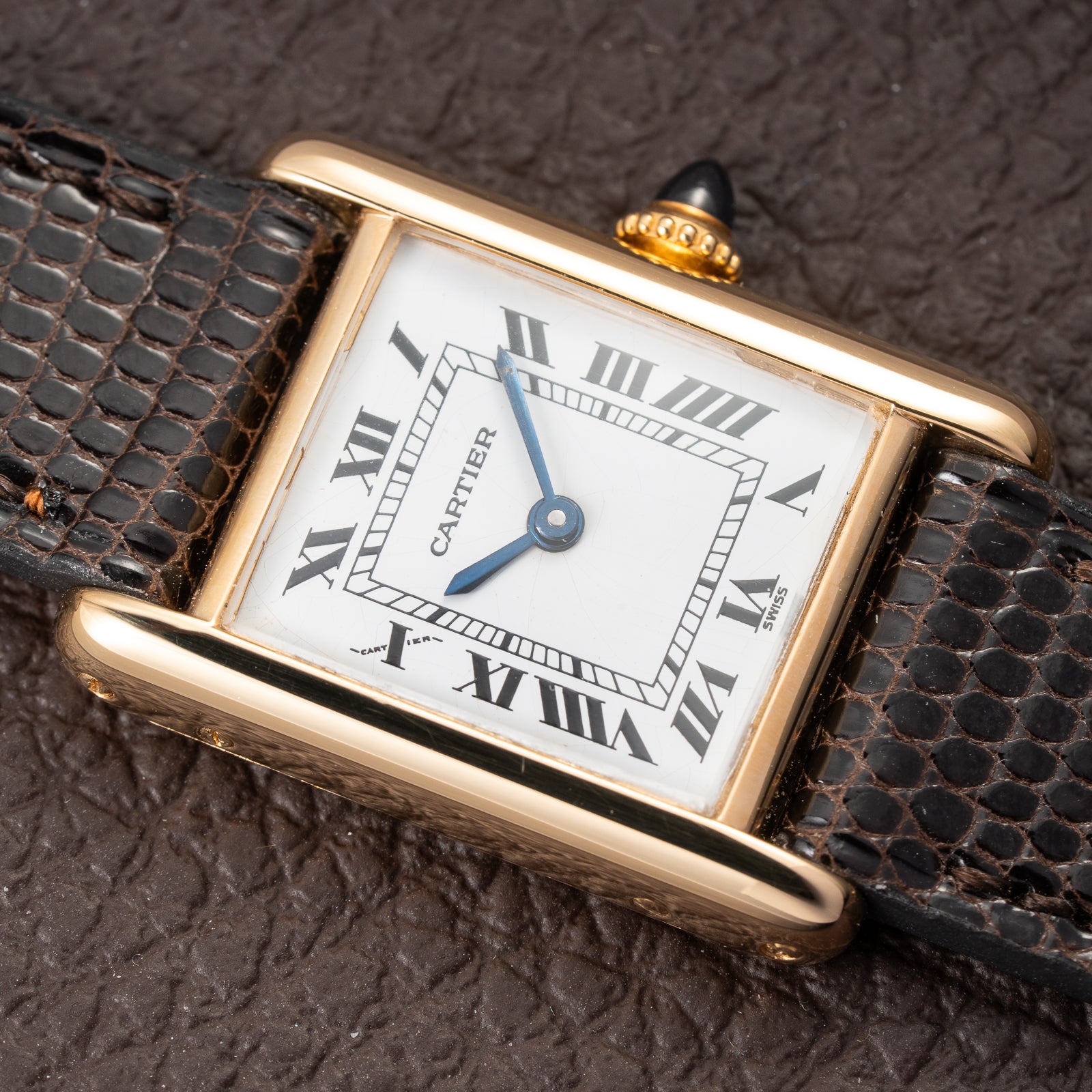 The factory-original "Cartier Swiss" dial, signed simply "Swiss" at 6 o'clock, has developed a pleasing patina, enhancing its vintage character. It showcases jet-black Roman numerals, an inner chemin-de-fer minute track, and blued steel sword hands—all in stunning harmony.