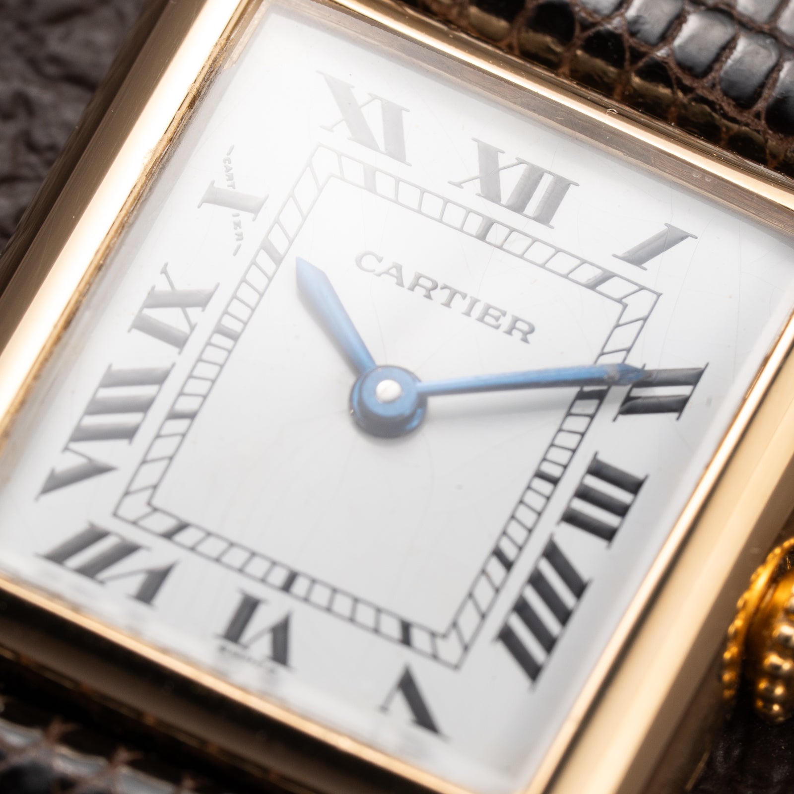 Dial: Cartier “Swiss” signed dial with black Roman numerals, signed “Swiss”, showing patina
