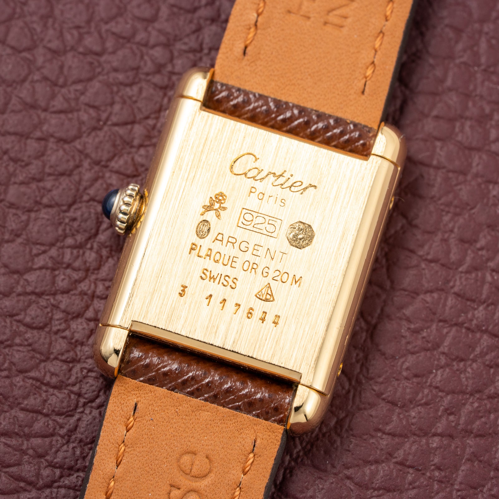 The 28 x 28 mm vermeil case houses elegant blue steel hands, which perfectly complement the radiant dial. Adding to its signature Cartier charm is the sapphire blue cabochon crown, a hallmark of the maison’s refined design.