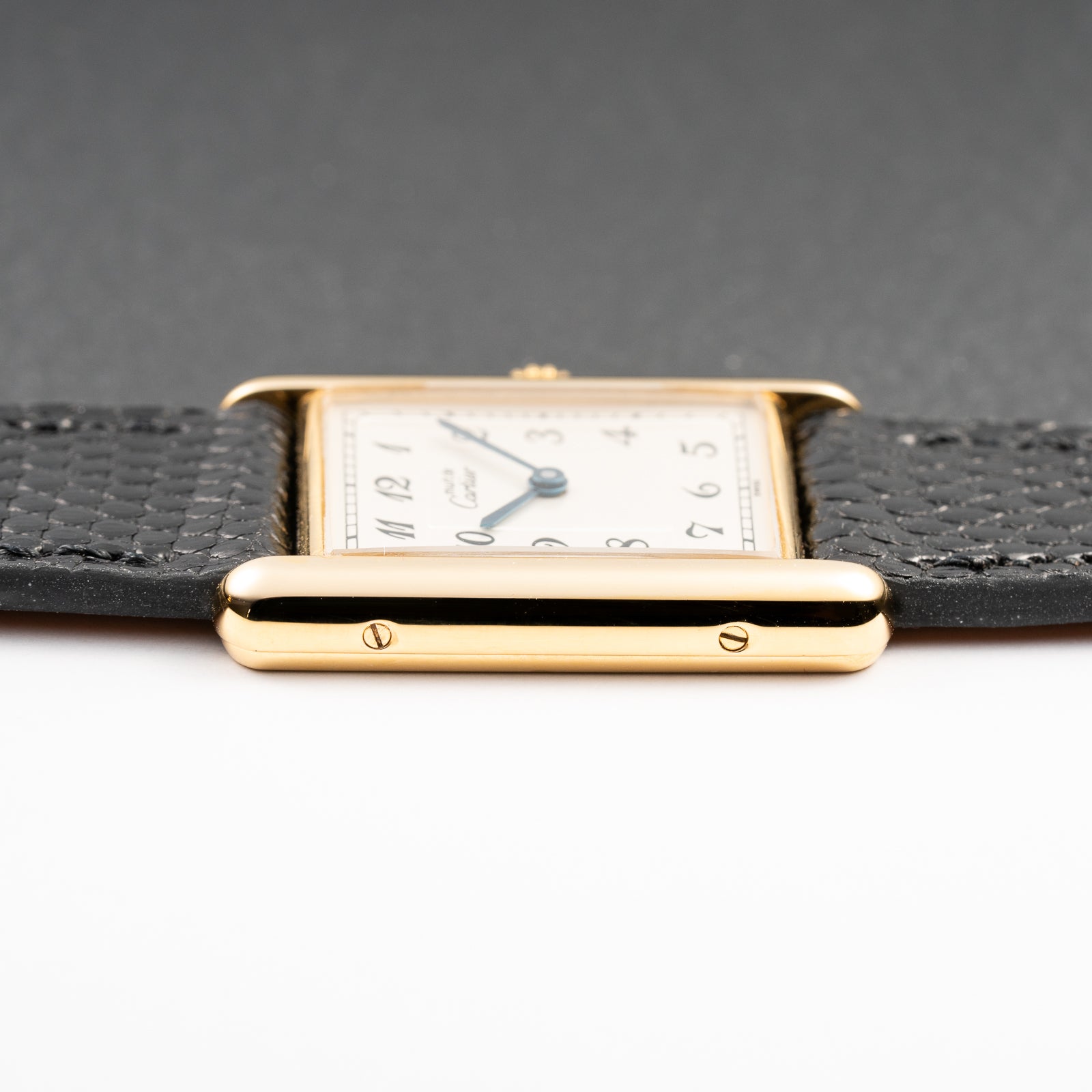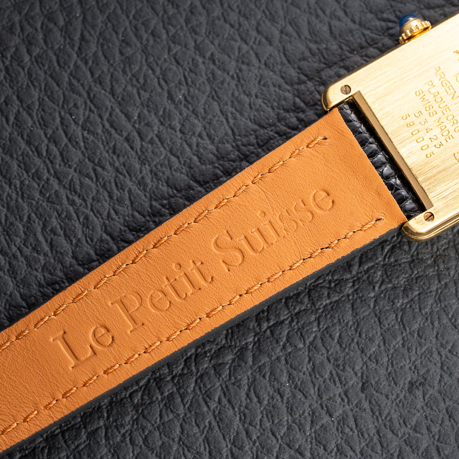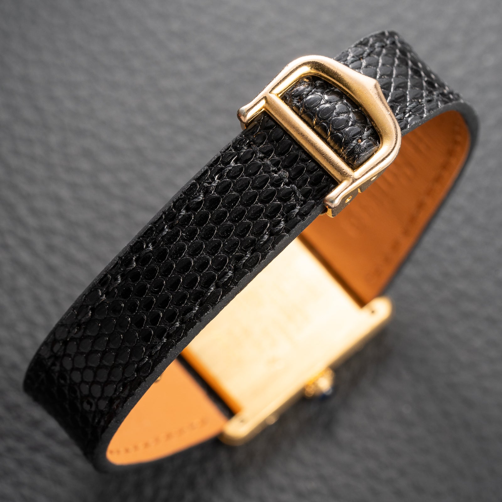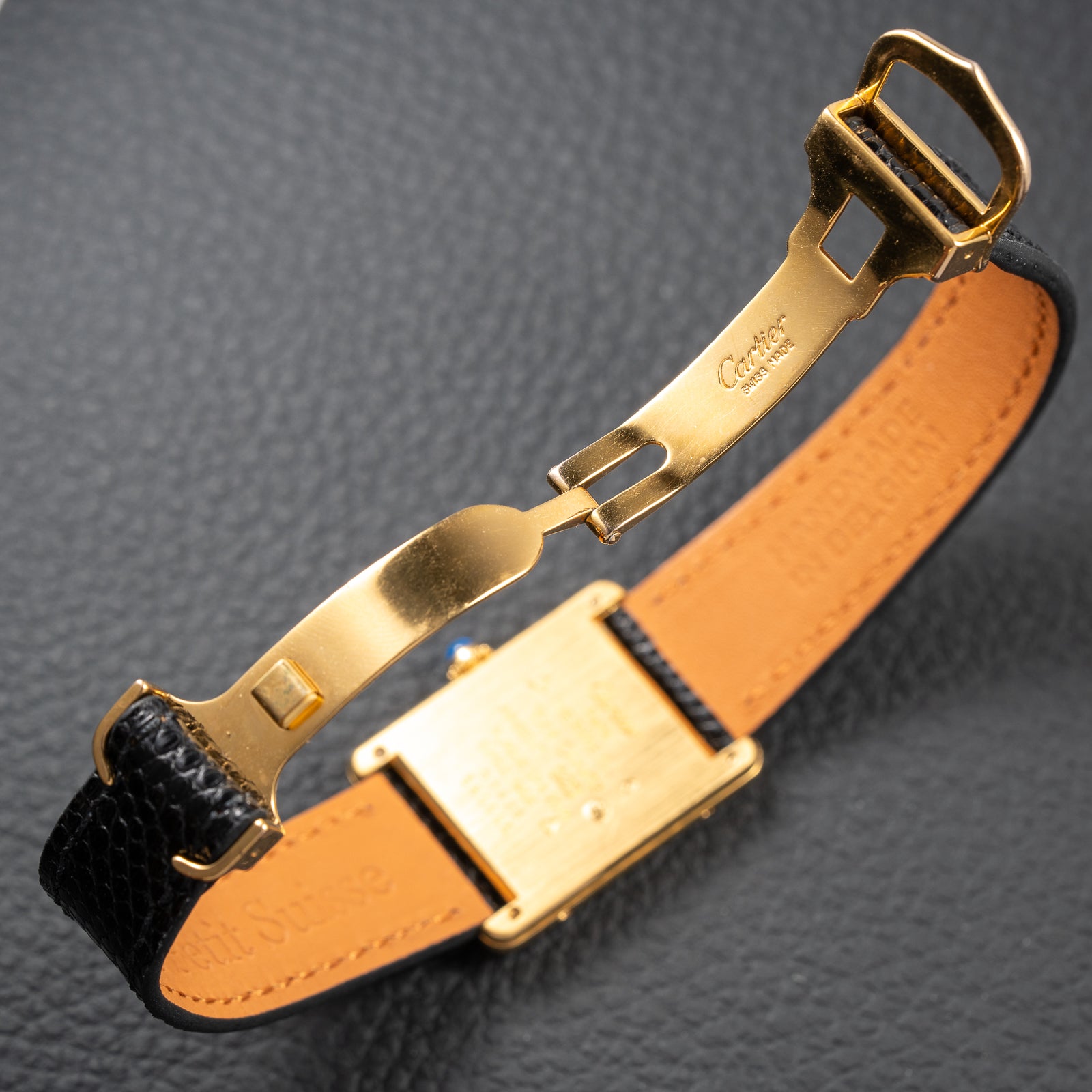 This watch comes fitted with a brand new, hand-made leather strap sourced from Belgium, distinguished by artisanal quality and a supple, tailored fit. Unlike typical pin buckles, it is paired with the original Cartier gold-plated deployment clasp, a luxurious and secure closure that enhances its authenticity and value.