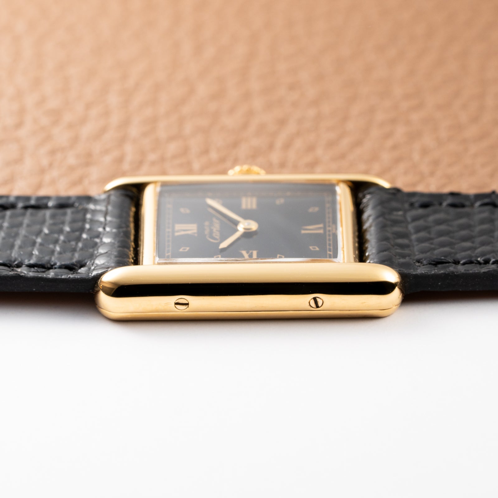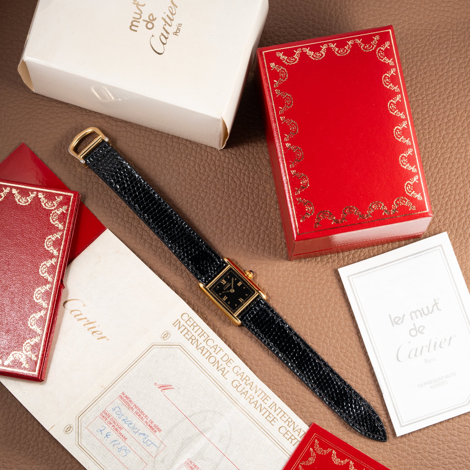 The combination of its rare black Art Deco dial with oversized gilt numerals and its complete set of original documentation elevates this Must de Tank beyond the ordinary. While many Must de Tank models feature champagne or traditional Roman numeral dials, the bold black-and-gold execution of this 1989 example makes it an exceptional find for seasoned collectors.