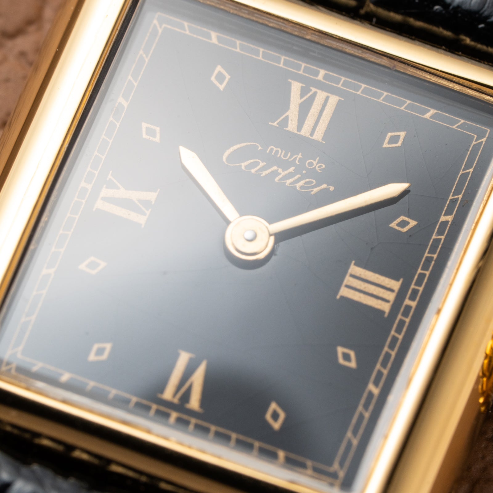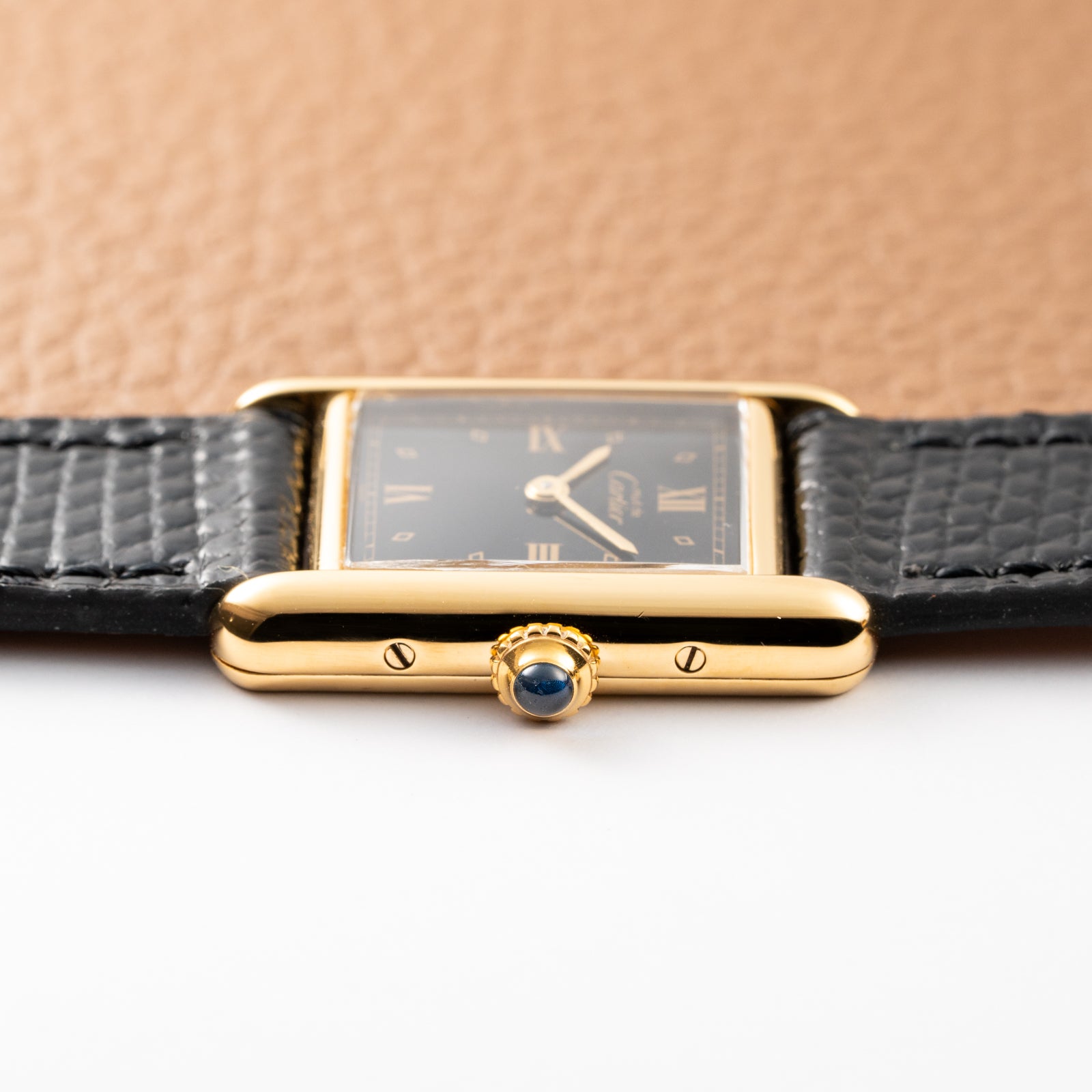 Condition remains very good for its age, with the dial retaining its deep black tone and golden Roman numerals exhibiting excellent contrast. The case shows only light wear consistent with over 30 years of careful ownership, while the clasp bears expected signs of plating loss. Mechanically, the quartz movement runs precisely, true to Cartier’s standard of reliability.