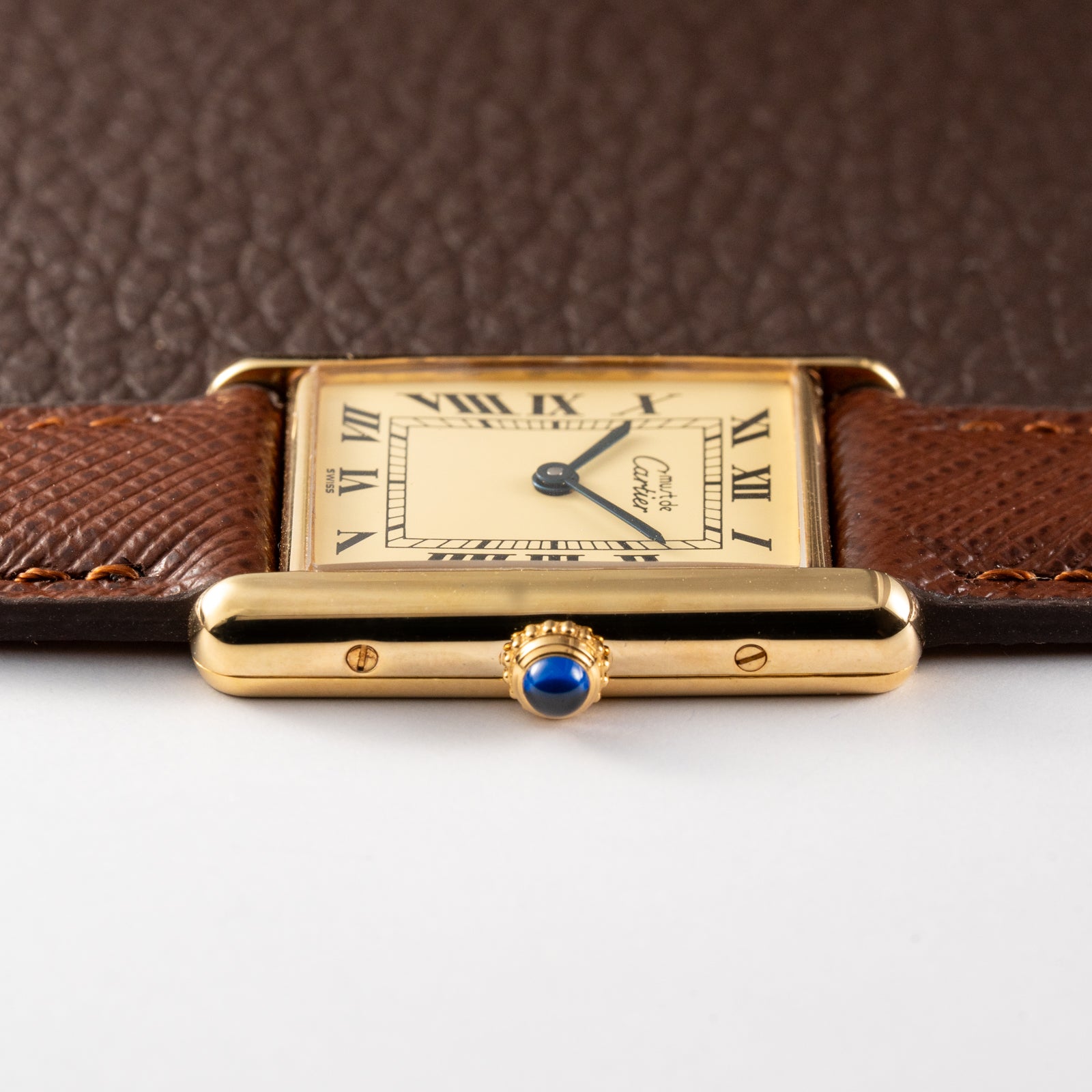 Completing the regal aesthetic is the Cartier signature sapphire cabochon crown, a detail as synonymous with the brand as the Tank design itself. The watch is paired with a brand-new, hand-crafted Belgian leather strap and a gold-plated buckle—tastefully matched, though not from Cartier—adding modern comfort to this vintage treasure.