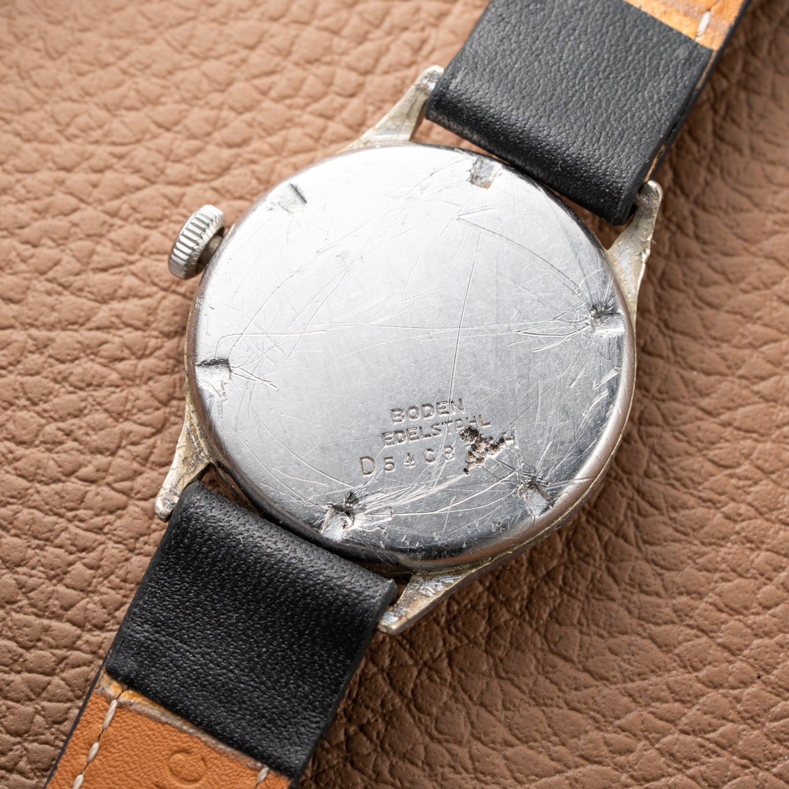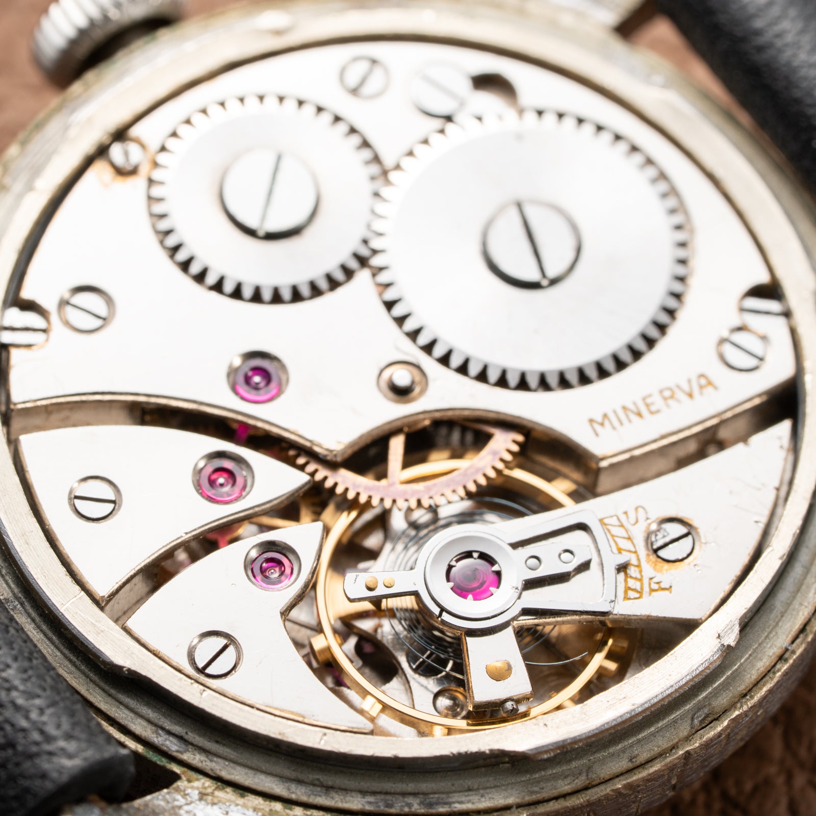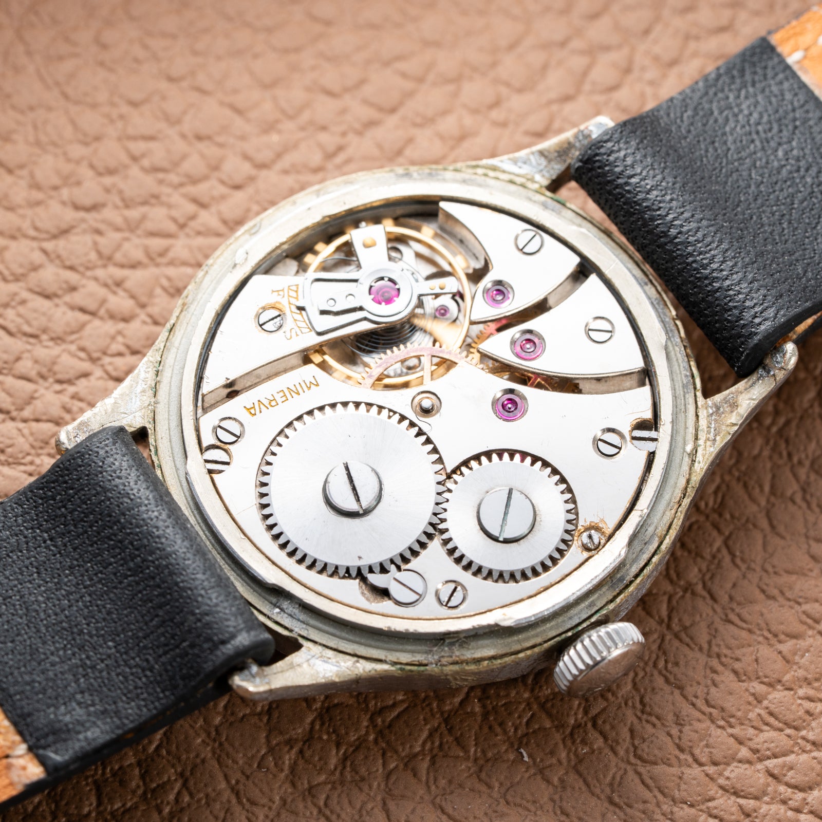 During WWII, Minerva was one of the Swiss manufacturers contracted to supply rugged and reliable timepieces for the German armed forces. These watches were marked “D.H.” (Dienstuhr Heer), denoting official issue to the Heer, or German Army. In a period where materials like stainless steel were prioritized for direct military use, chrome-plated cases were commonly employed for wristwatches.