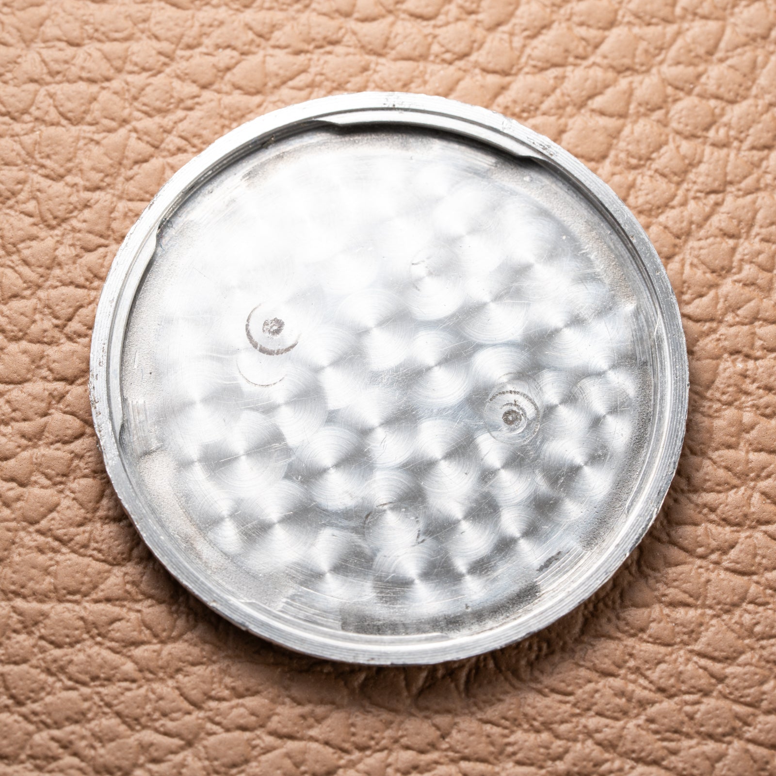 Case: Chrome-plated brass case measuring 34mm wide by 42mm lug-to-lug, and 10mm thick. Back is stamped “Edelstahl” (German for stainless steel).