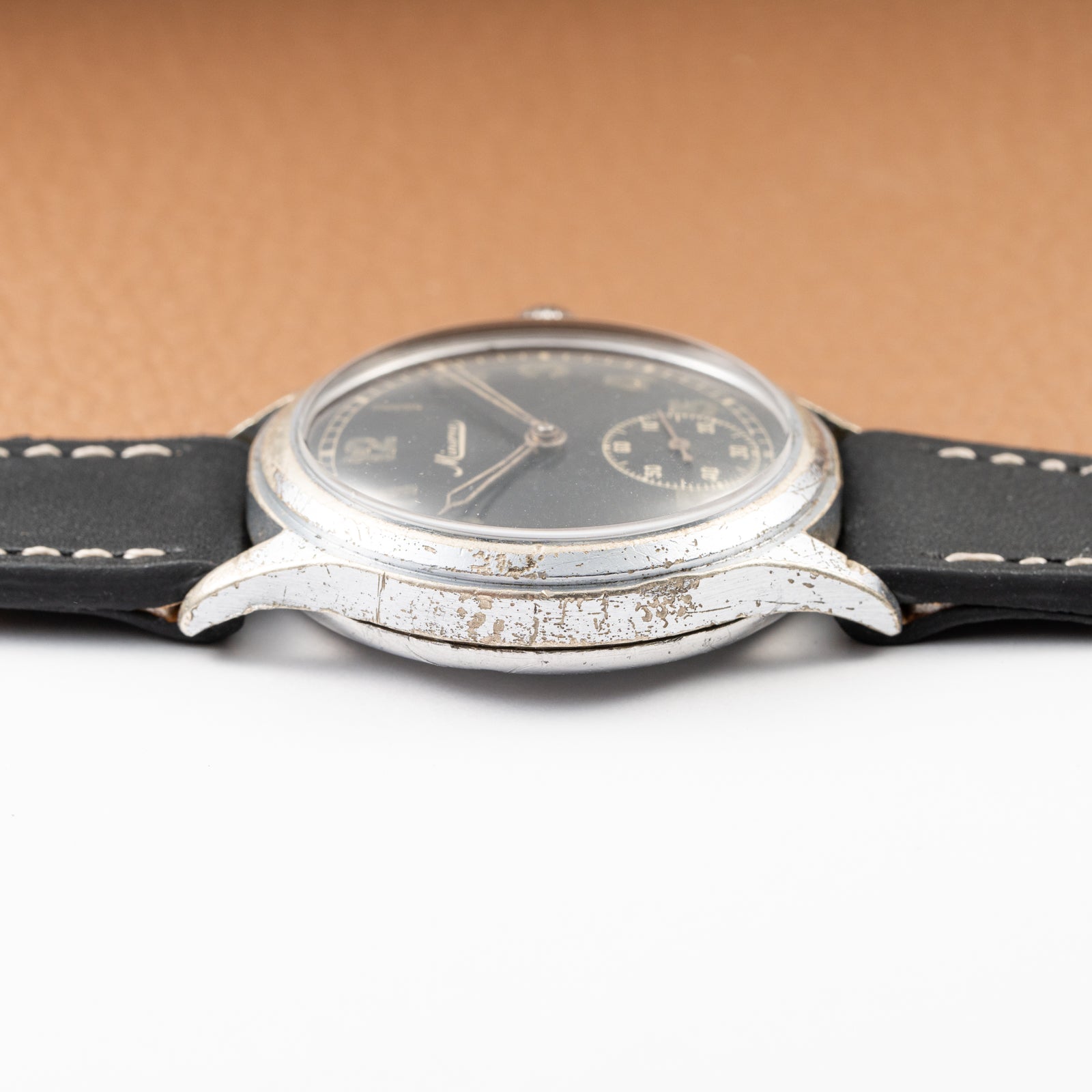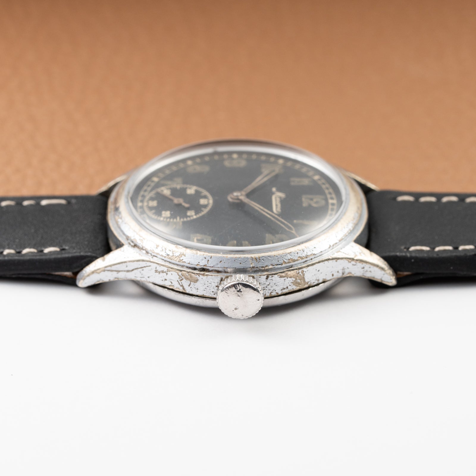 This particular example retains its original features, including a matte black dial with radium-painted Arabic numerals, and fixed 18mm lugs, typical of true military-issued watches.