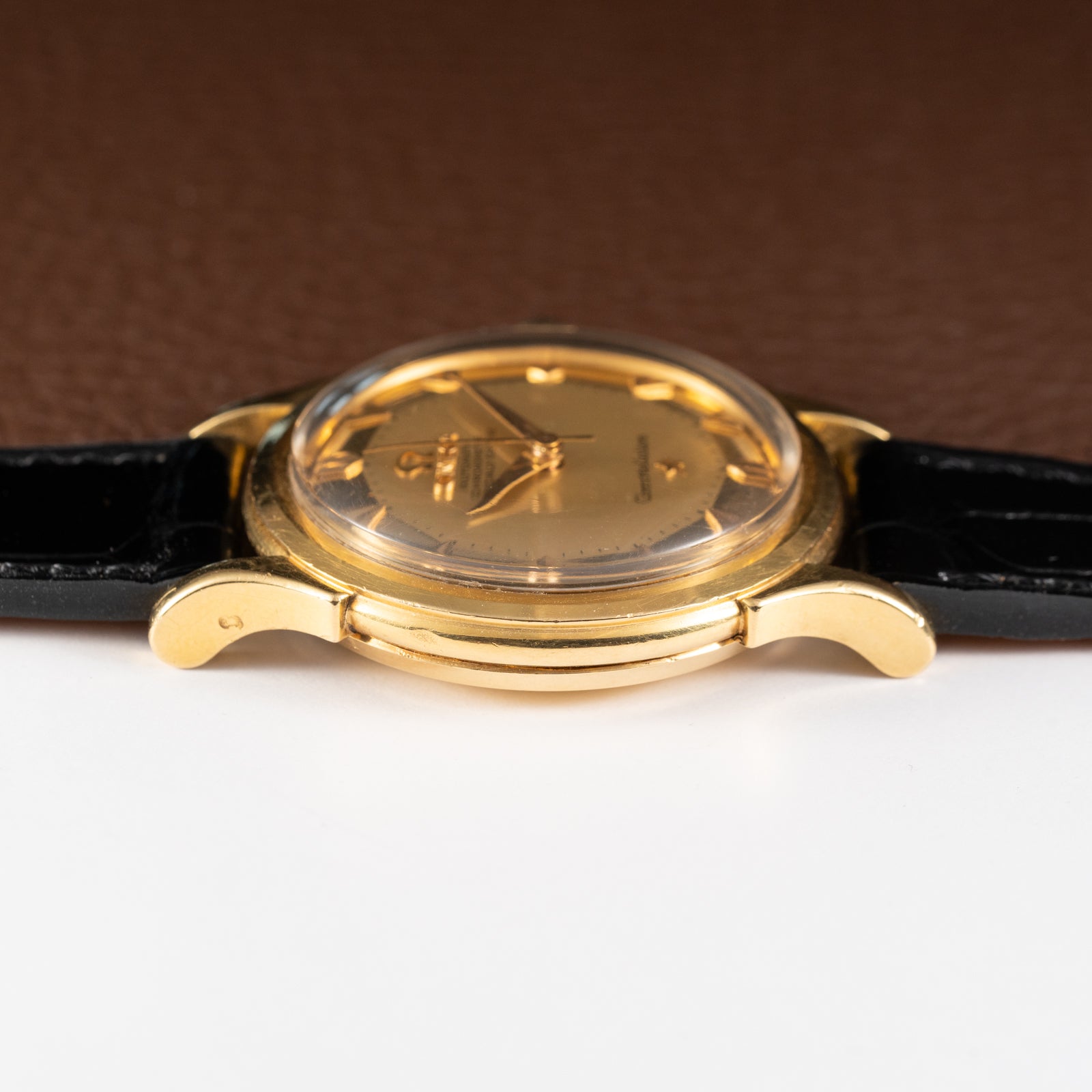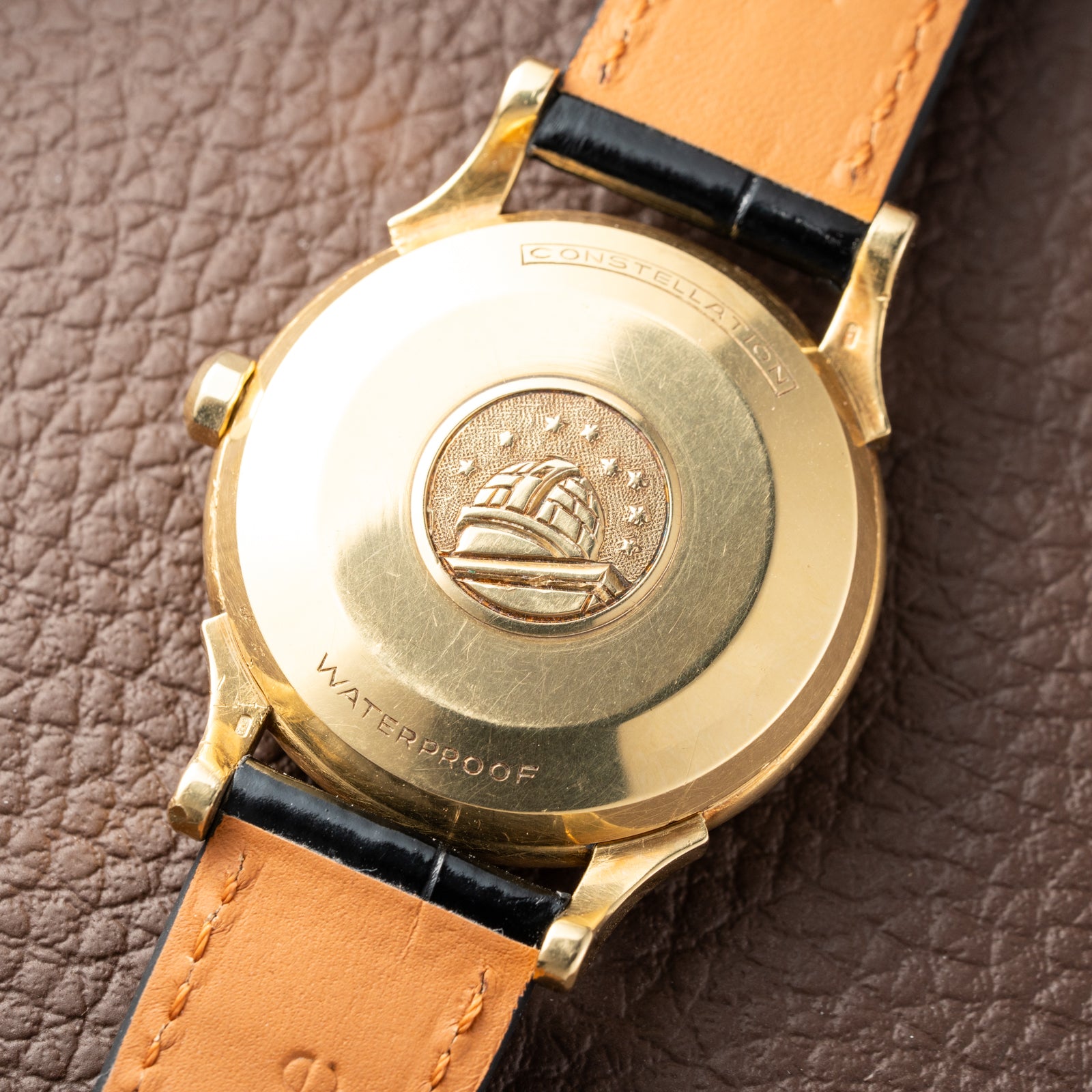 Encased in a remarkably heavy 18K yellow gold case, this Constellation exudes both luxury and permanence. The deeply impressed hallmarks remain clearly visible—a rare occurrence after nearly seven decades—speaking to the careful preservation of this piece. The strong, flared lugs and sharply defined bezel edges reinforce the watch’s architectural presence on the wrist.
