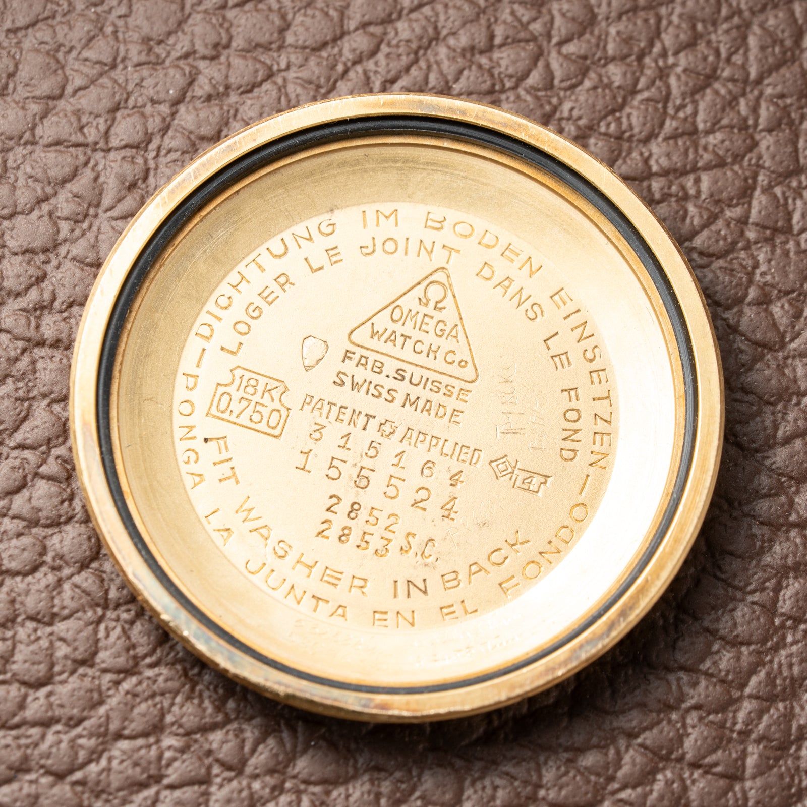 Crown: Octagonal Omega crown in matching 18K yellow gold, correct for this reference.
