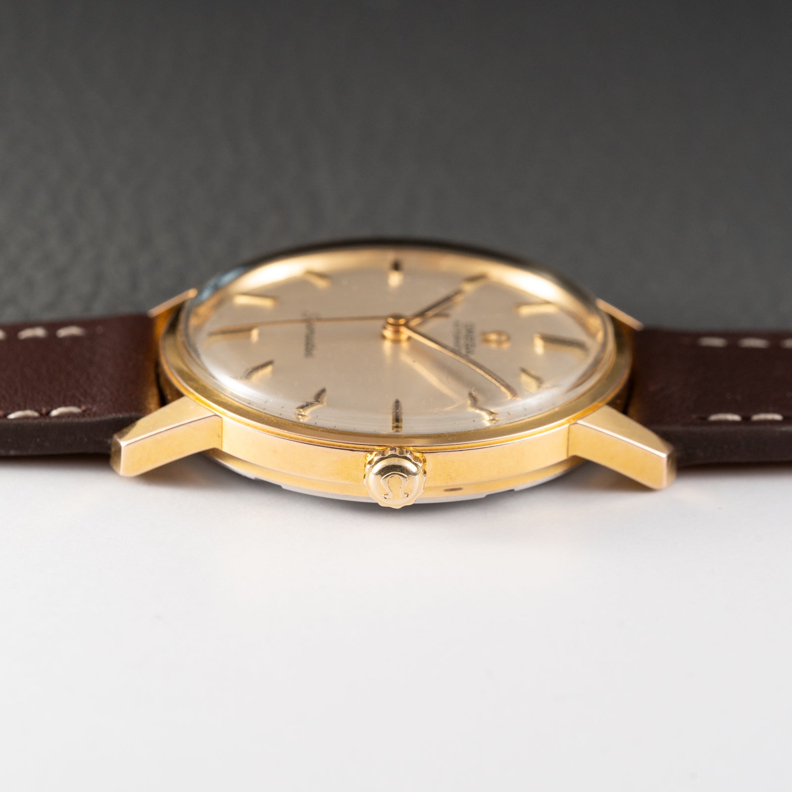 The dial presents as original Omega, showing a beautiful light patina that adds character without compromising legibility. Its classic layout—with applied gold hour markers, Omega’s signature at 12, and slender stick hands—embodies the minimalism of mid-century Swiss design. The gentle patina across the dial speaks to the watch’s history, enhancing its desirability among vintage enthusiasts.