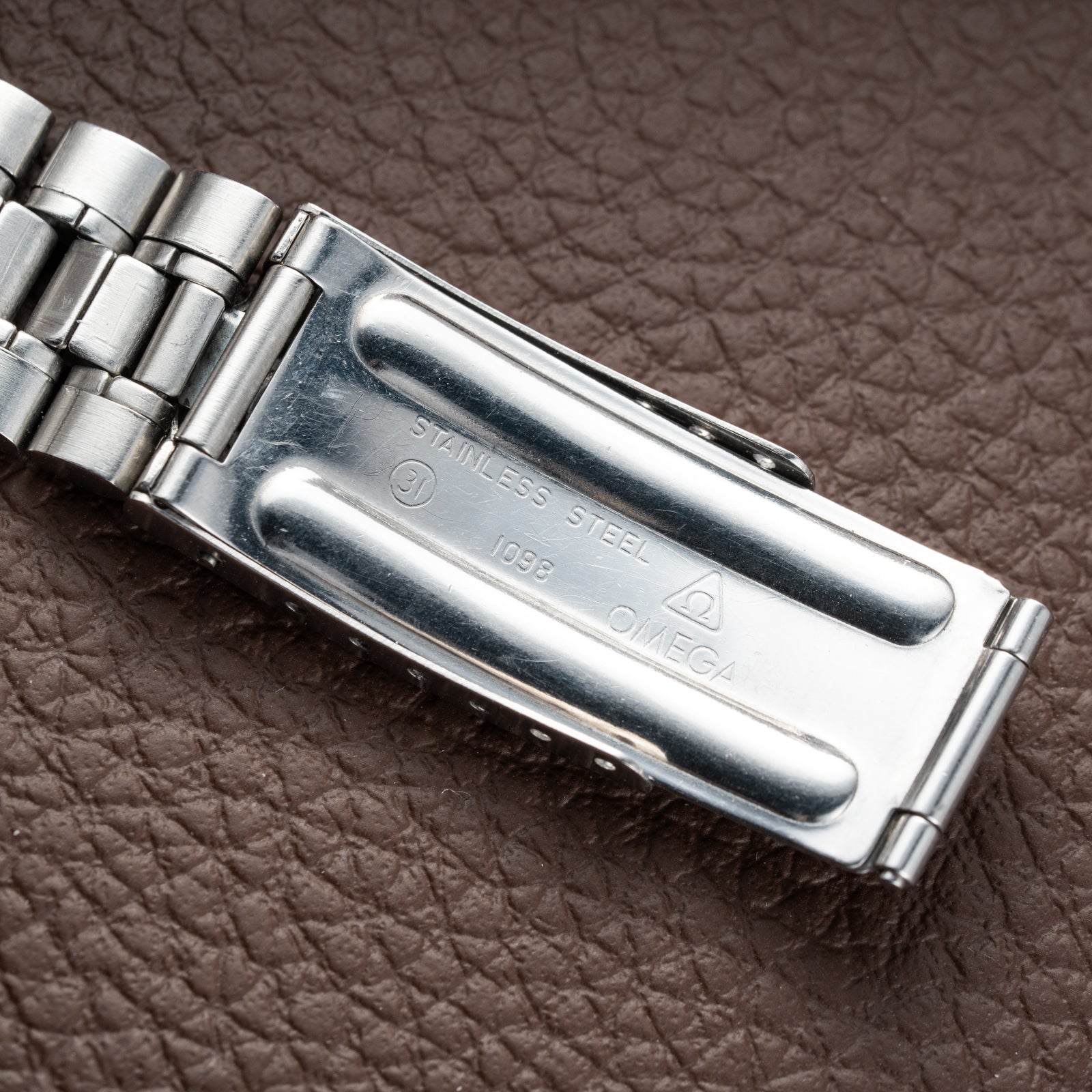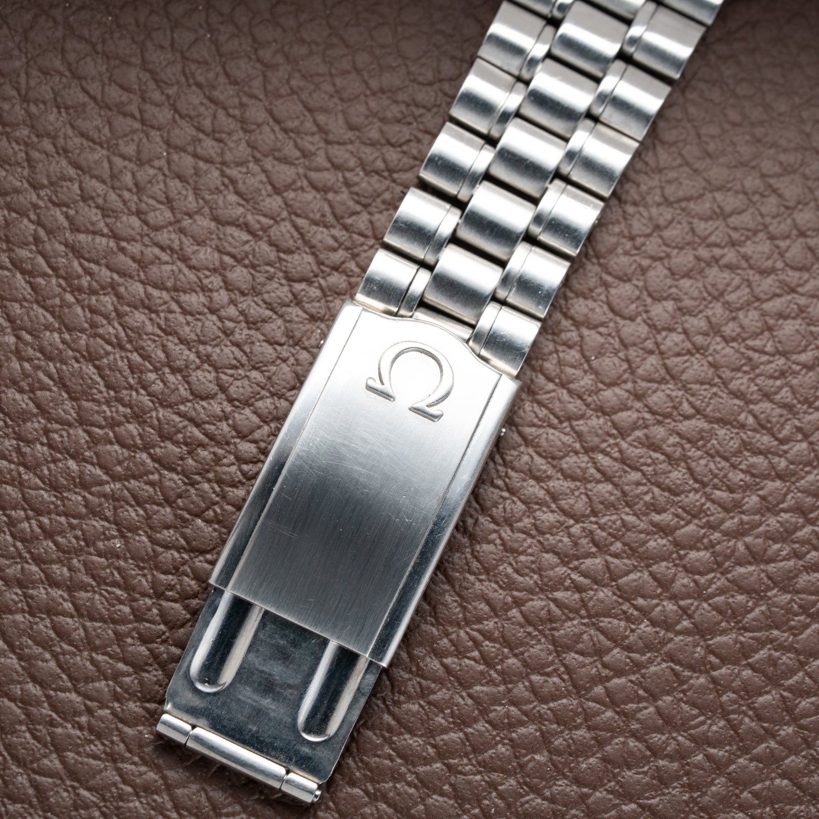 Completing this timepiece is the original Omega stainless steel bracelet—a rare find—featuring End Links 526 and Bracelet 1098. This very long bracelet (circa 19cm) ensures a comfortable fit, while the vintage-style buckle with the bold Omega logo adds a touch of heritage charm.