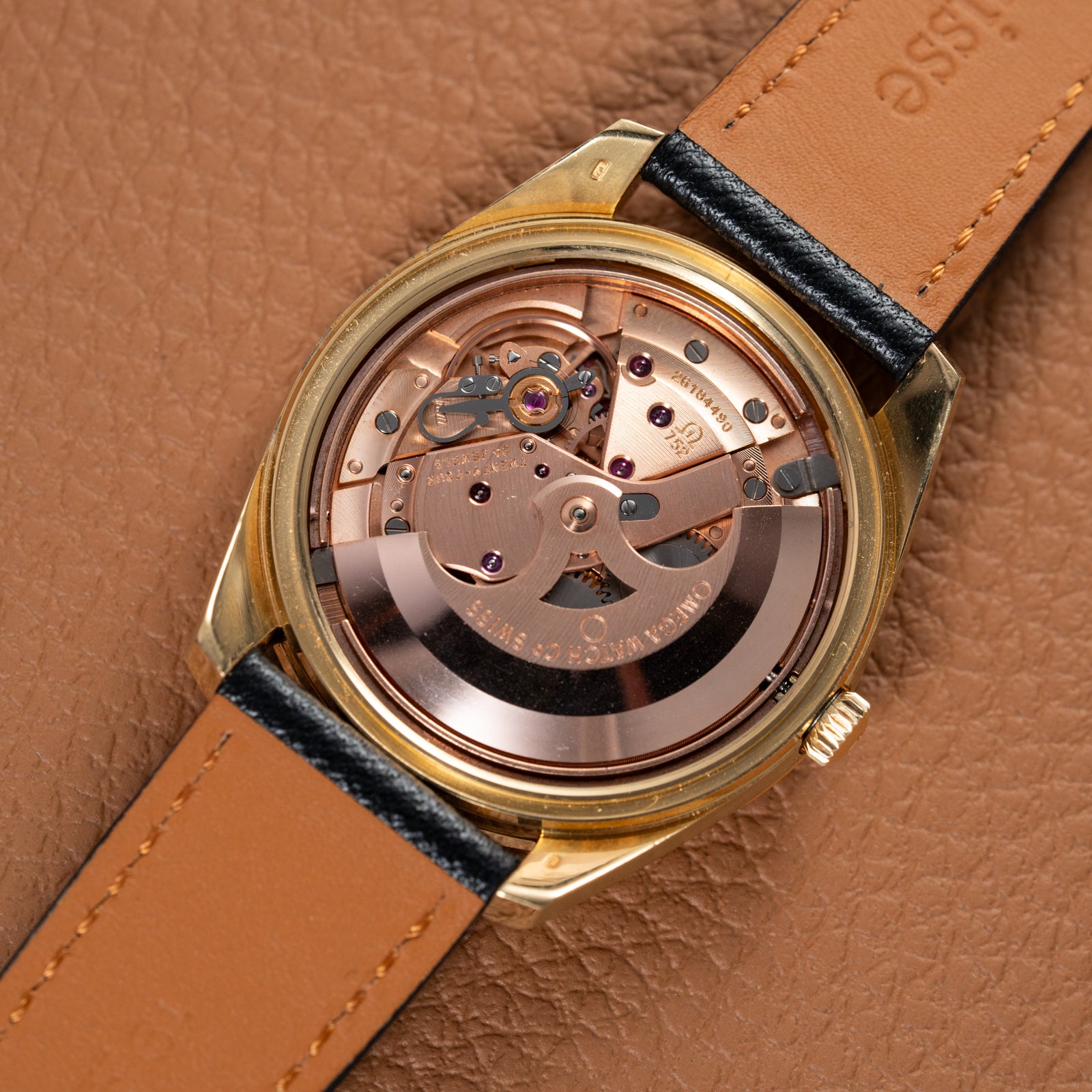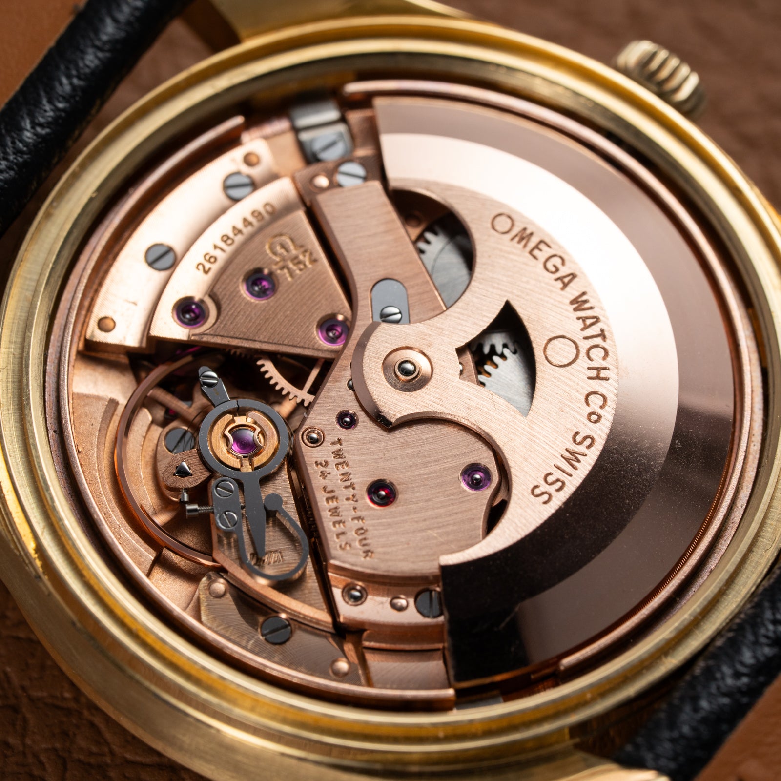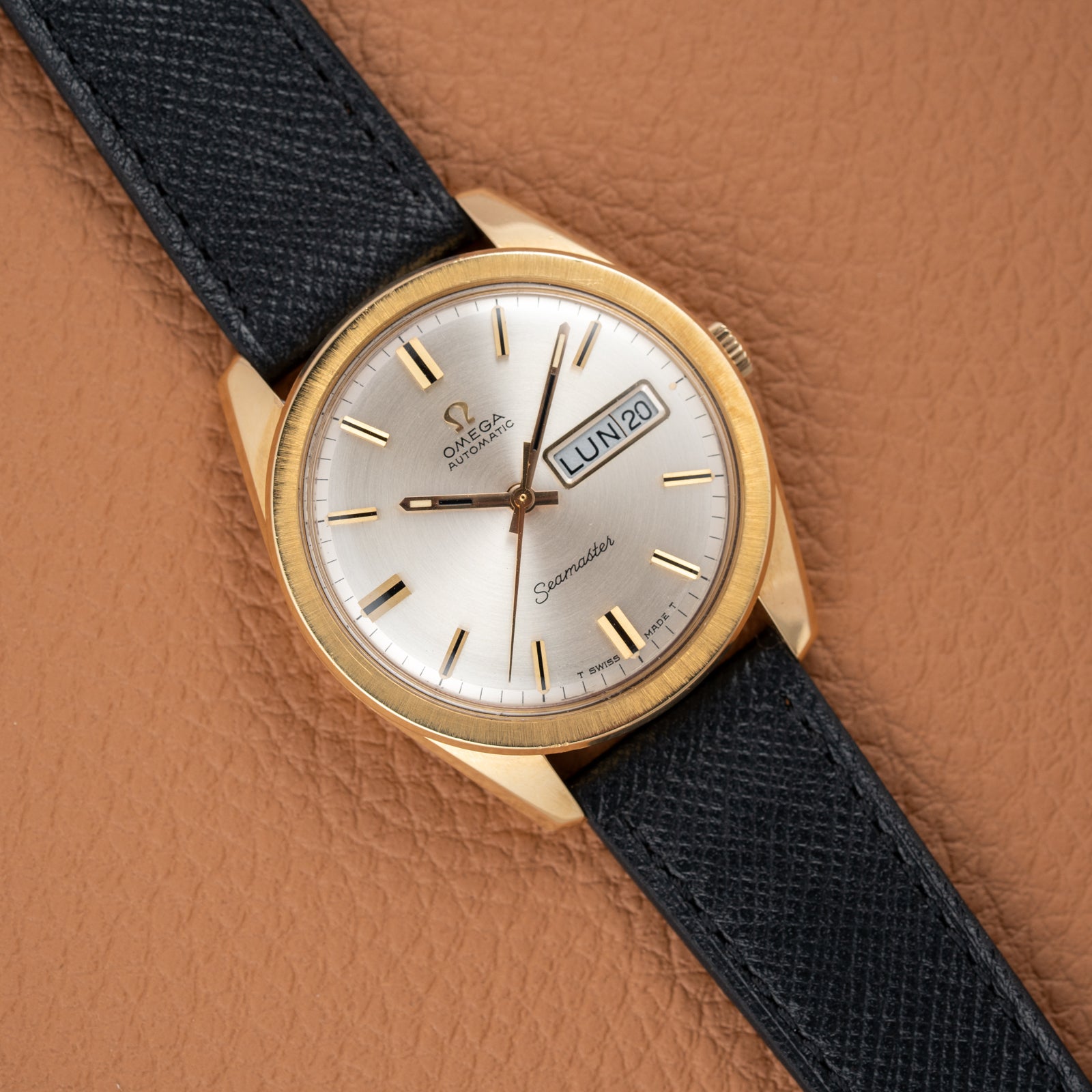 This Omega Seamaster, housing the reliable automatic calibre 752, is a true standout among vintage Omega pieces, with the added appeal of a rare Italian day disk. The watch’s robust 36mm case is crafted from solid gold, giving it an impressive presence and timeless elegance that makes it perfect for both daily wear and special occasions.