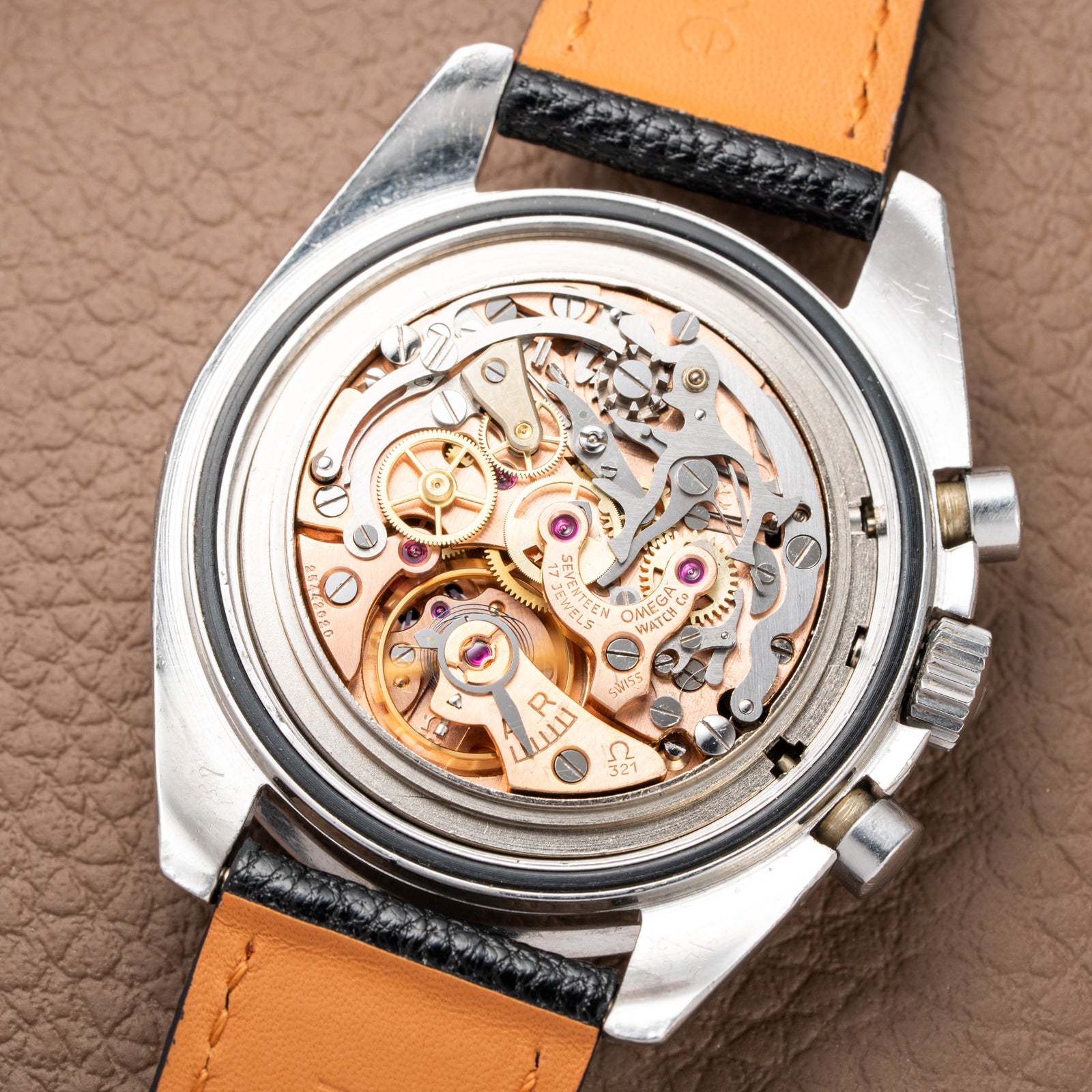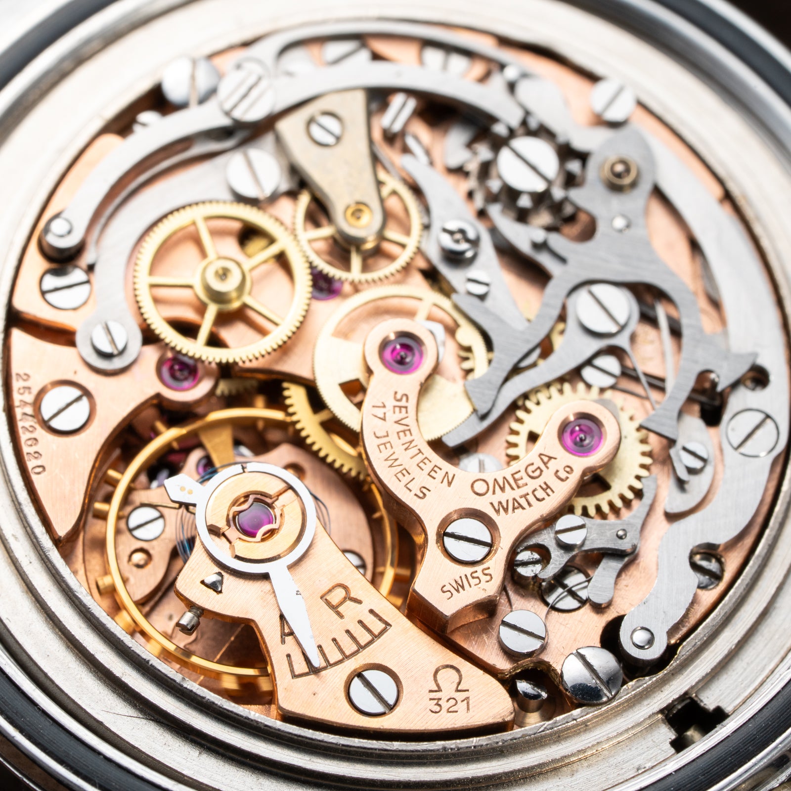 Movement: Omega Caliber 321 manual-wind chronograph, just serviced by a master watchmaker. A movement celebrated for its complexity, precision, and history—column wheel controlled and rhodium-plated. Running smoothly and offered with a 12-month mechanical warranty.