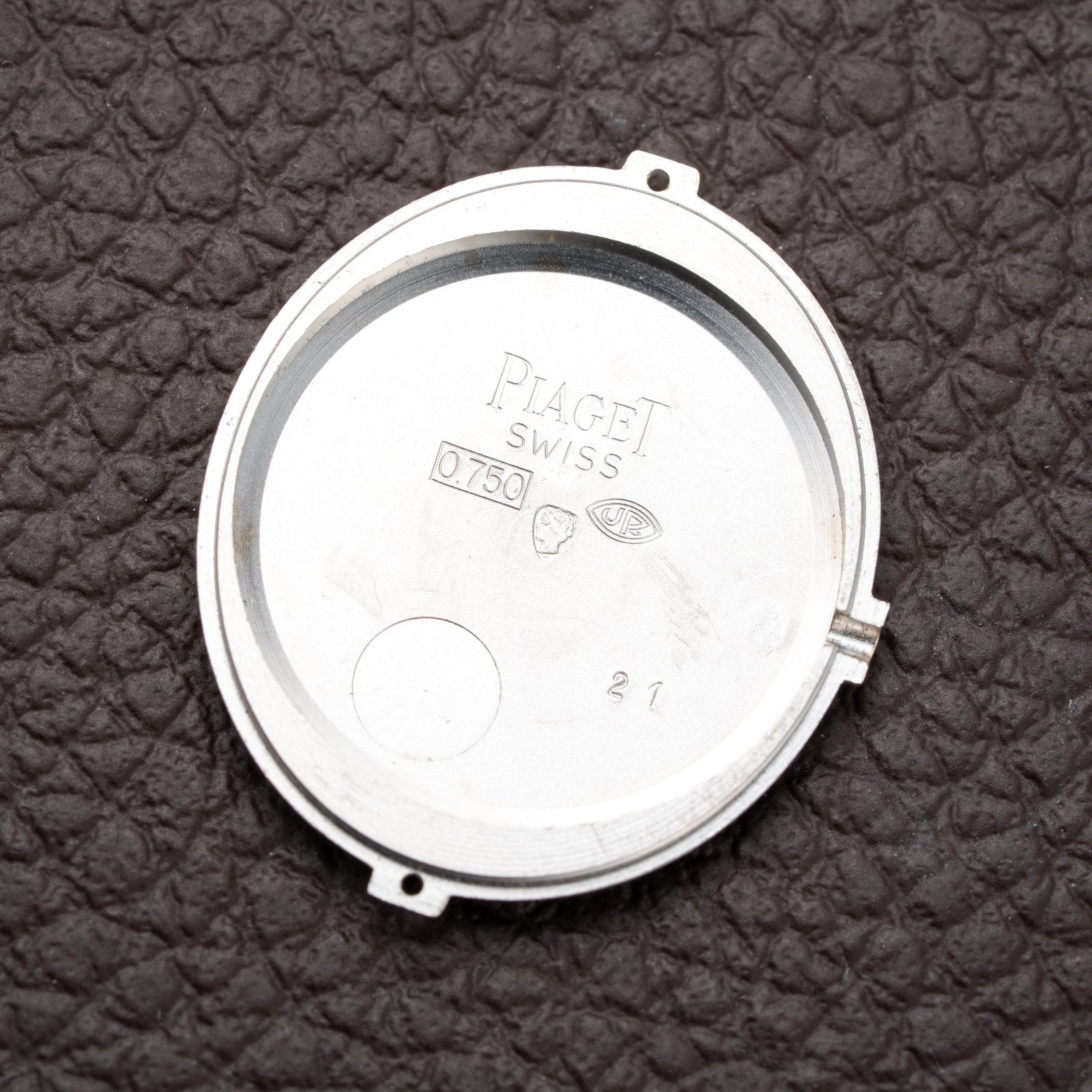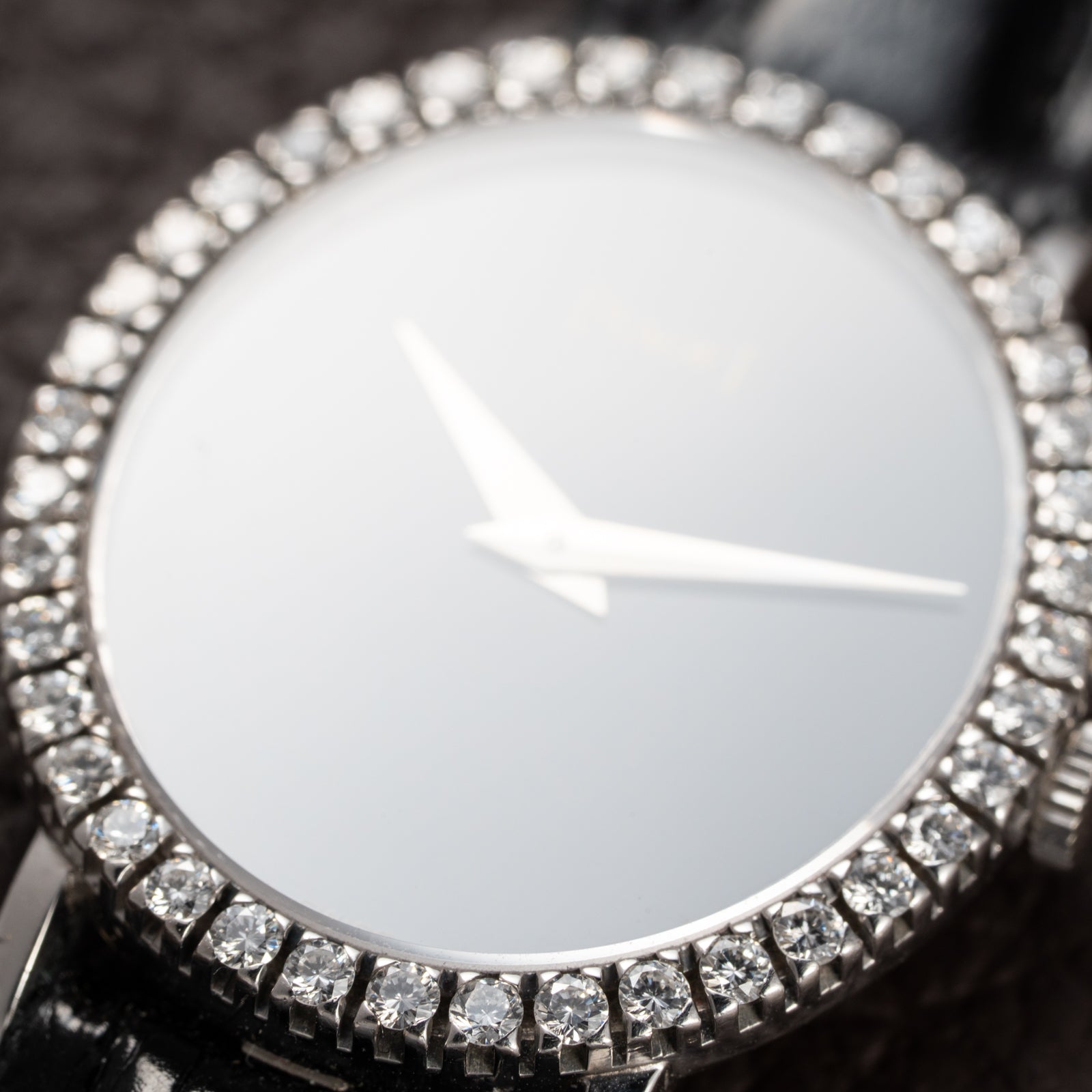 The 23 x 28mm oval case is fashioned from solid 18K white gold, its elegant curvature highlighted by an original factory-set diamond bezel. The watch remains in excellent unpolished condition, with sharp case edges and well-preserved gold hallmarks—a rarity among vintage Piaget pieces. Its slim architecture underscores Piaget’s reputation as a pioneer of ultra-thin luxury dress watches.