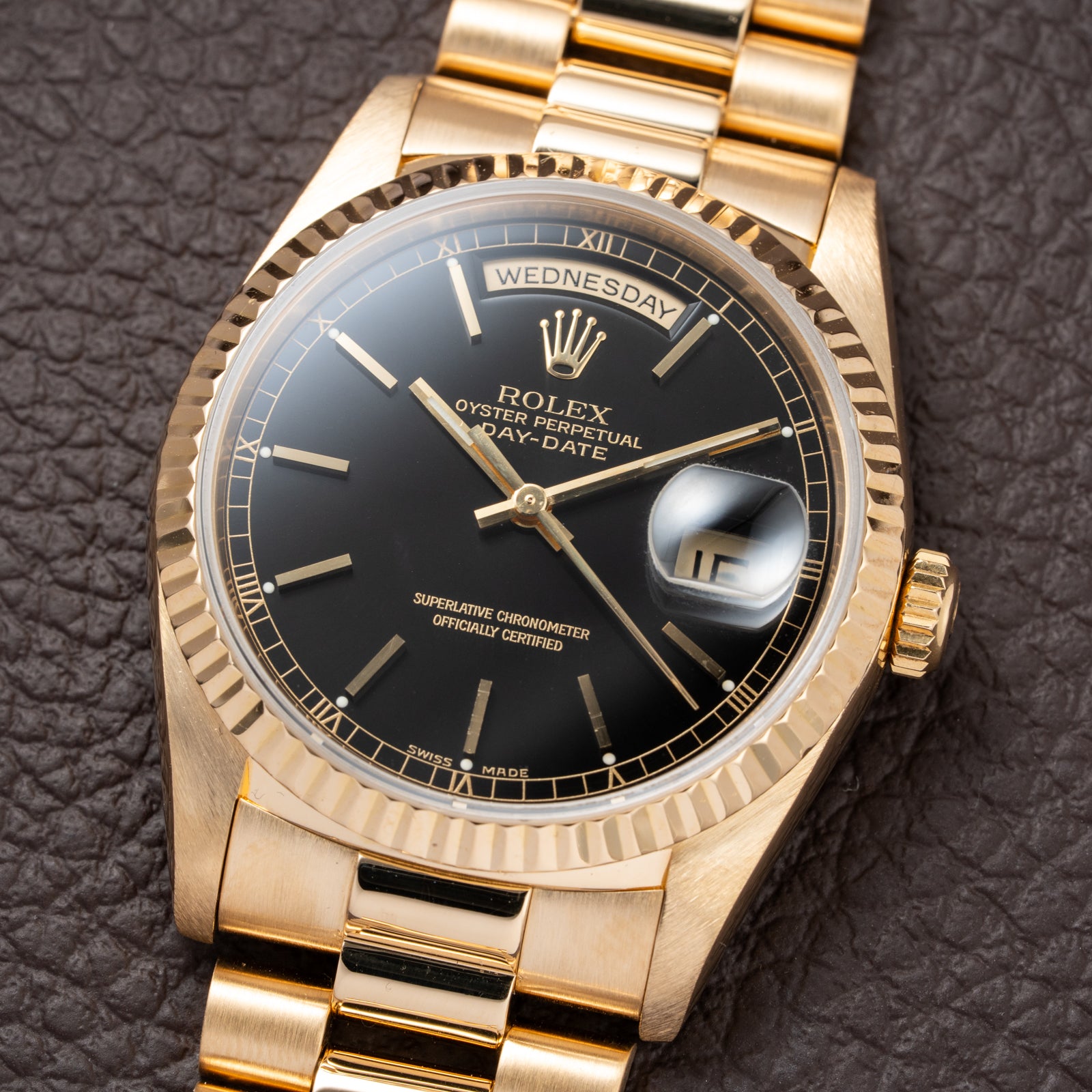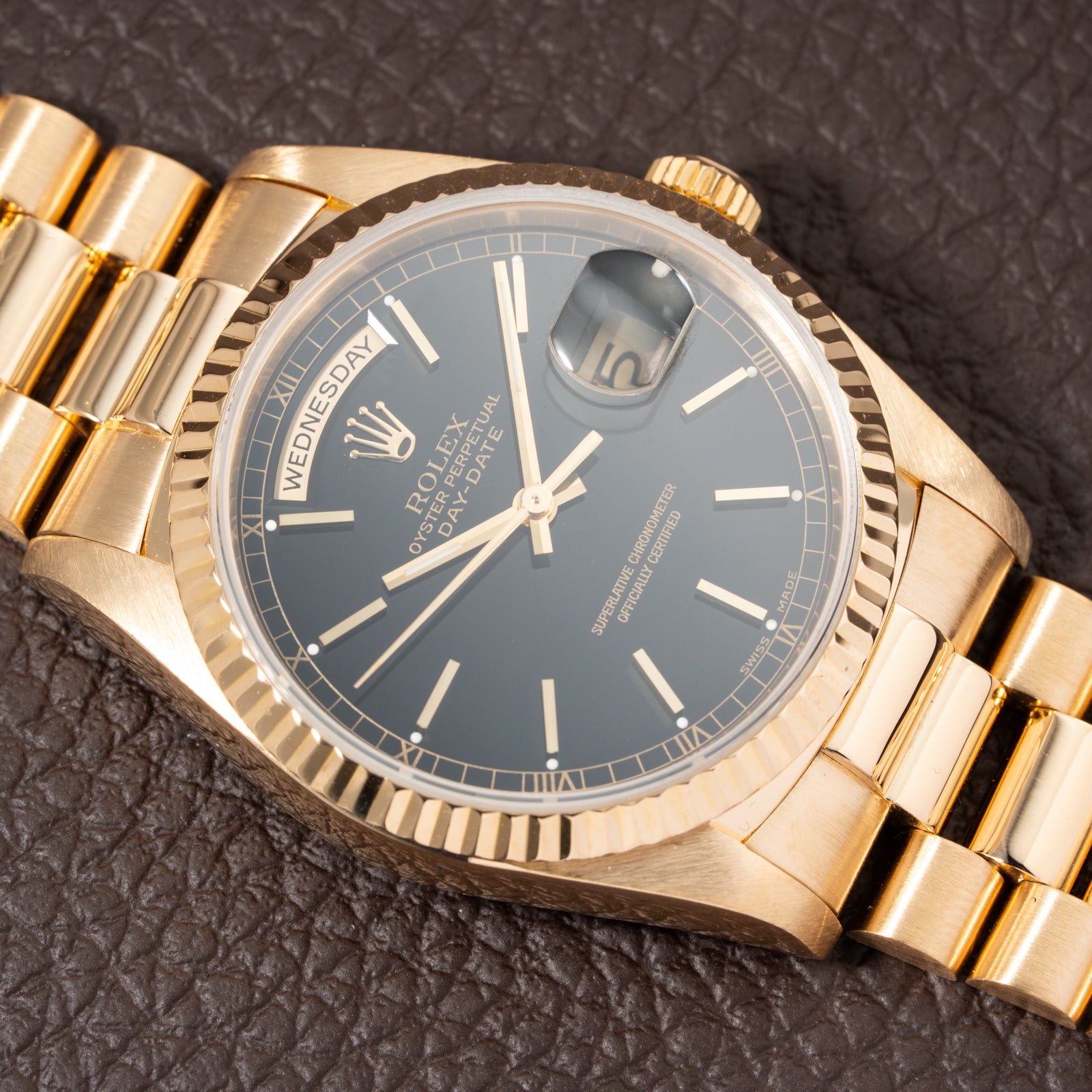 Rolex Day-Date Oyster Perpetual – 18K Yellow Gold Black Dial (Ref. 18238, Circa 1990)